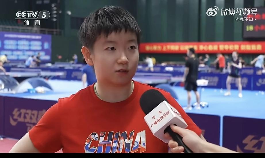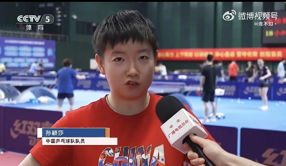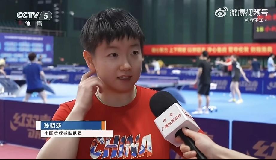 接受采访的孙颖莎身穿红色球衣,精神饱满,气色动人,谈吐从容,言之有物。