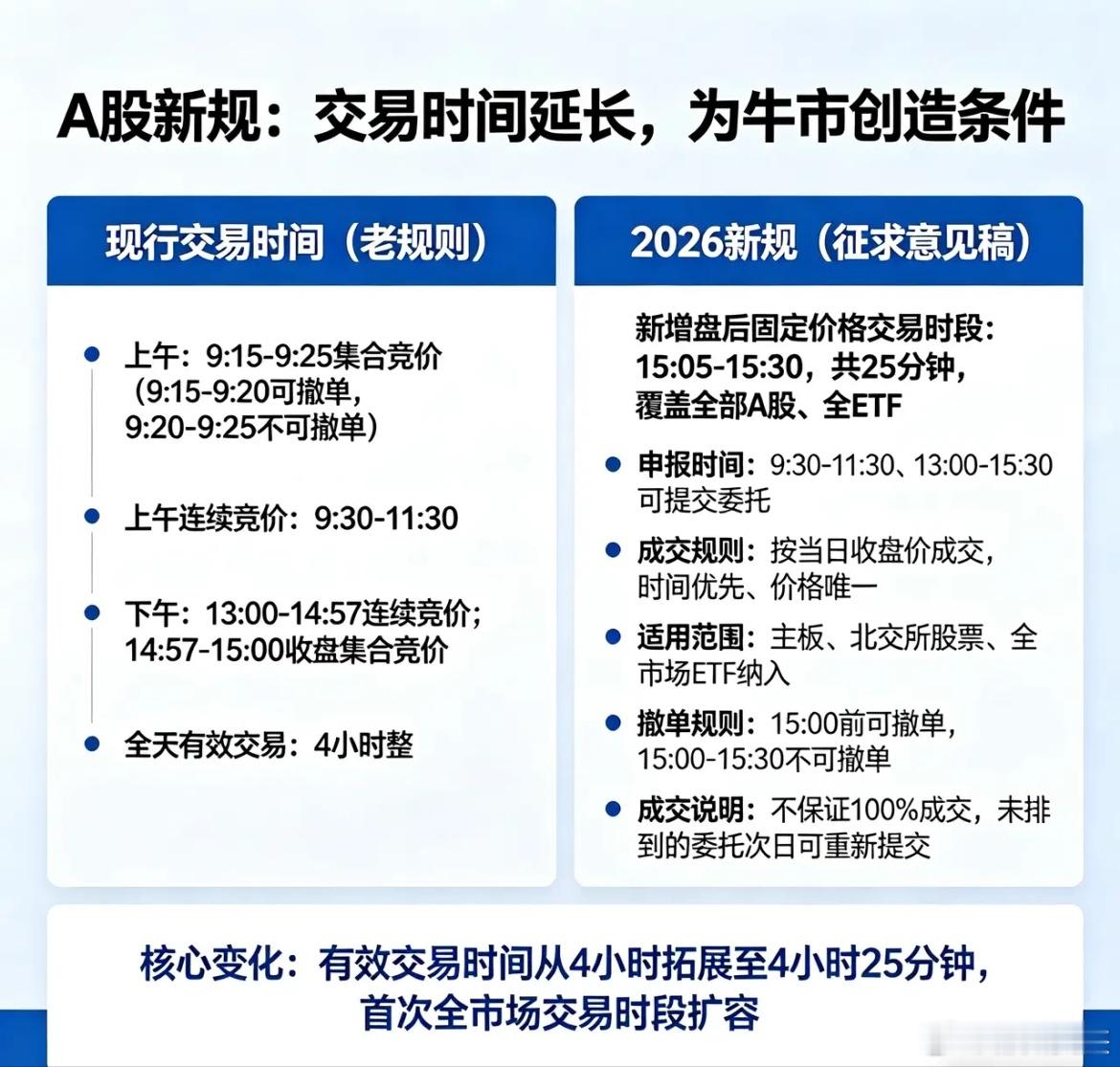 新政对股市影响 A股市场新规,利好不断!值得期待,也值得仔细琢磨,研究,尽快适应新的市场!A股改革这次是真的大刀阔斧!4月10日的政策组合拳相当有力度。交易机制市场化改革里,盘后固定价格交易扩容到全部A股和基金,方便中长期资金入市;基金收盘机制优化,让价格更稳定;ST股涨跌幅限制统一,解决定价效率问题。六部门联合推动中长期资金入市,这是要给市场注入新活力。再加上之前落地的短线交易监管新规,严管内部人、松绑长钱、压制投机。以前大股东疯狂套现、游资无脑打板的玩法正在失效,市场逻辑大变。很多散户还按老思路操作,结果亏损连连。现在的A股已不是从前,咱们投资者也得跟上改革步伐。