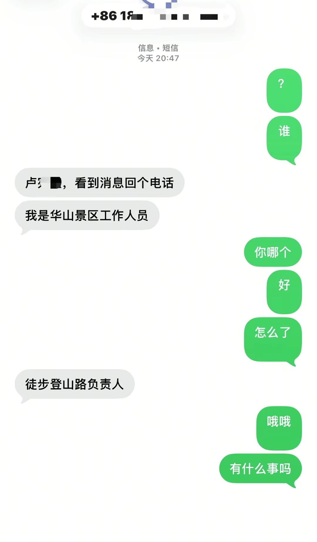 清明假期,卢女士去爬华山,一天爬了两次结果给华山景区徒步登山路负责人的短信问候。