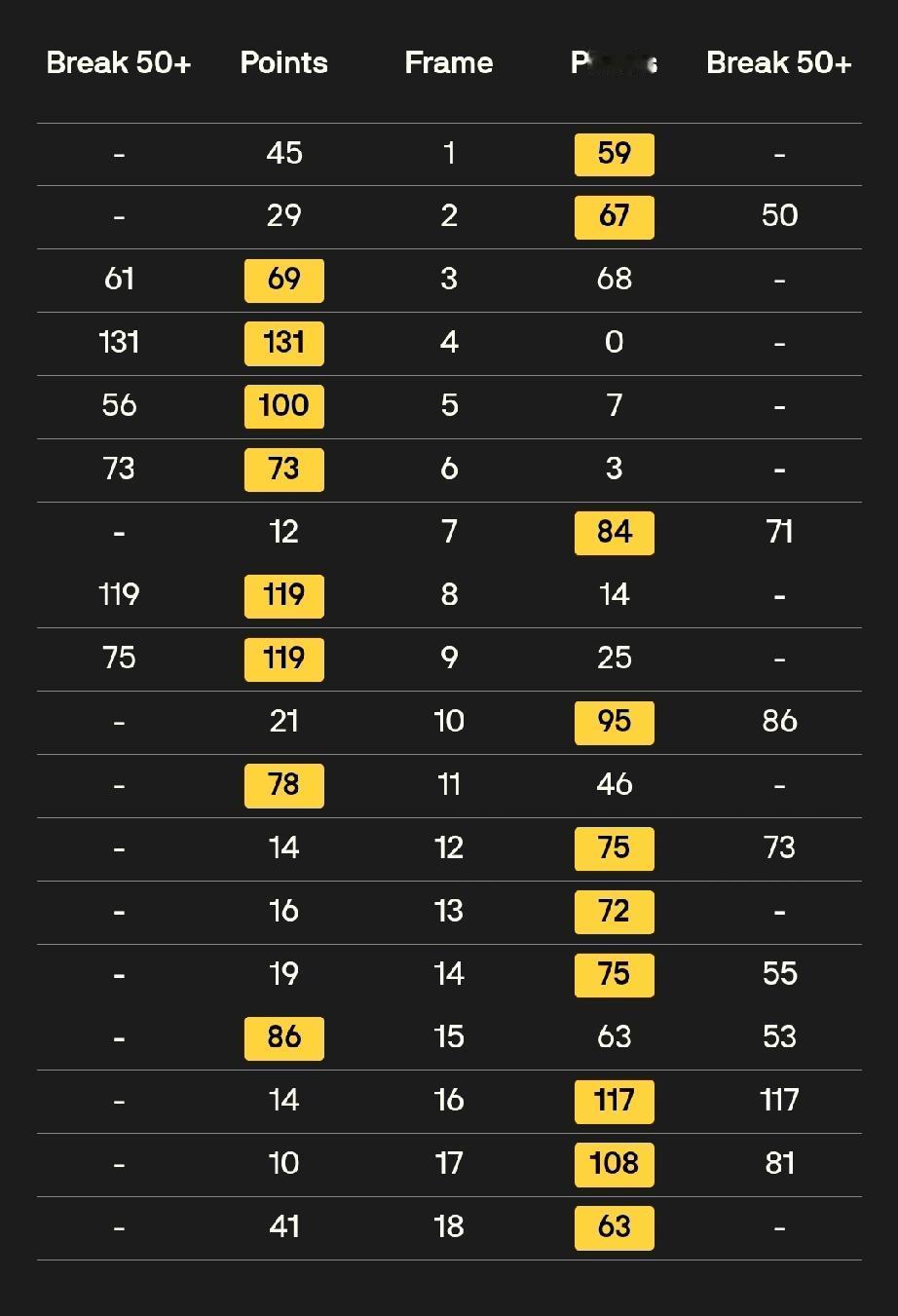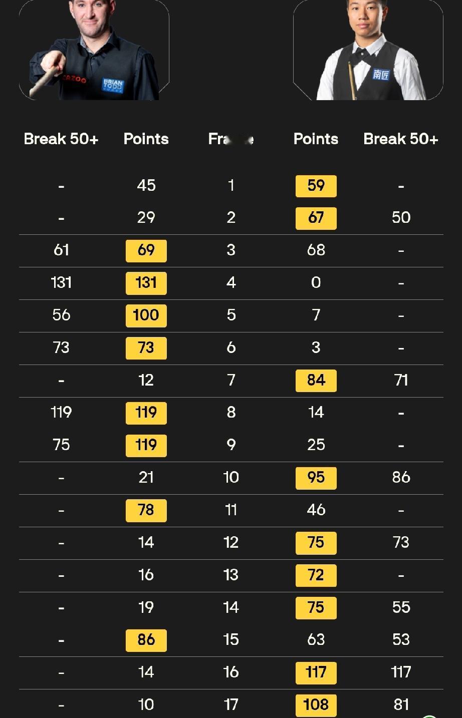 昨晚的第一阶段比赛,高阳开局2-0领先!随后,福德打出两杆单杆破百4杆50+,6-3领先高阳。