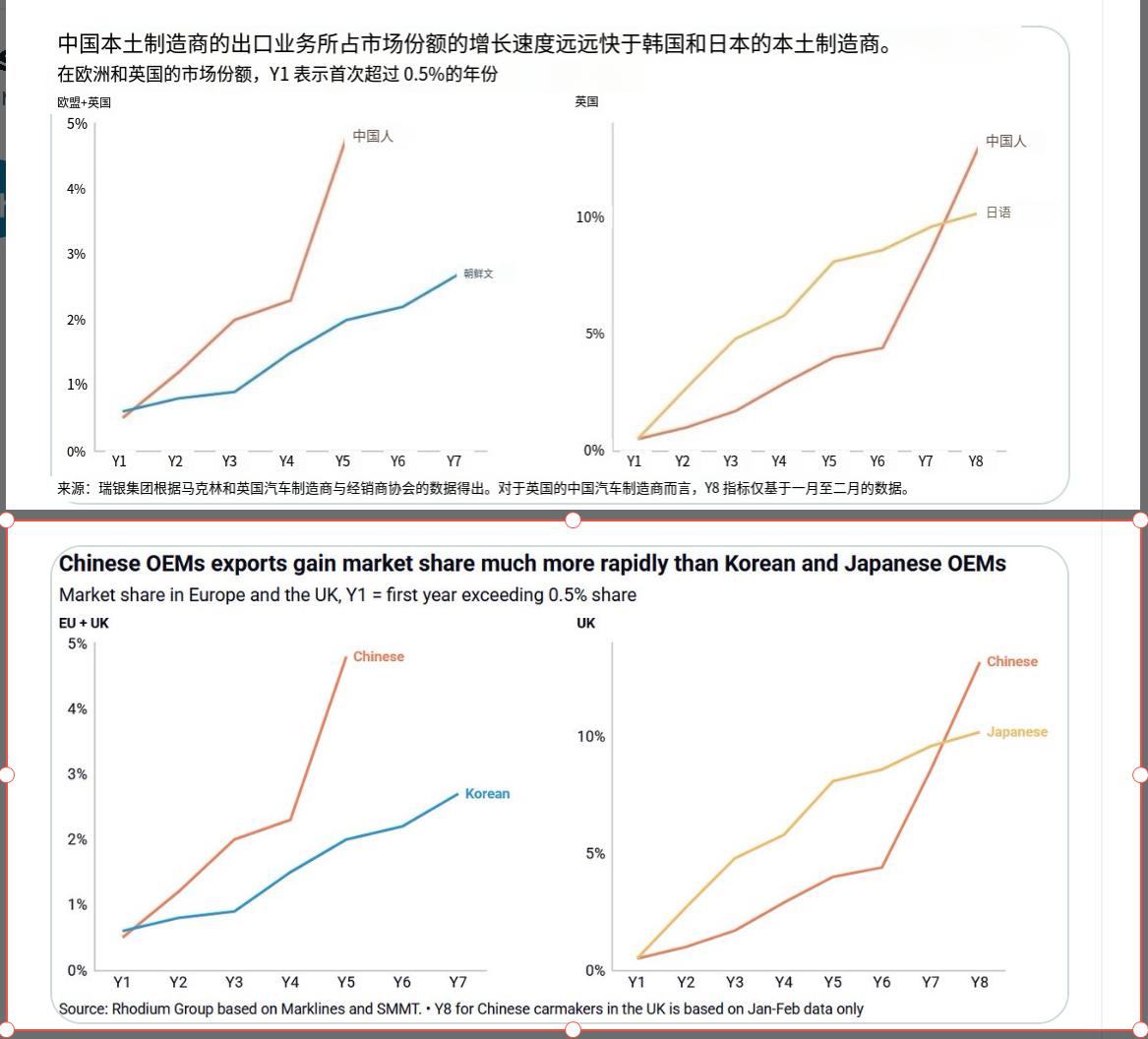 中国汽车制造商,尤其是比亚迪、奇瑞和上汽,正在以前所未有的速度扩大欧洲市场份额。这与分别于上世纪70年代和90年代进入中国市场的日本和韩国汽车制造商的经历明显不同。中国本土制造商的出口业务所占市场份额的增长速度远远快于韩国和日本的的本土制造商。