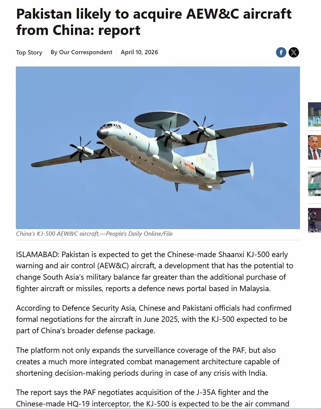 当地时间4月10日,据巴基斯坦媒体的报道称,目前巴基斯坦方面正在就采购空警-500预警机与东大进行正式谈判。