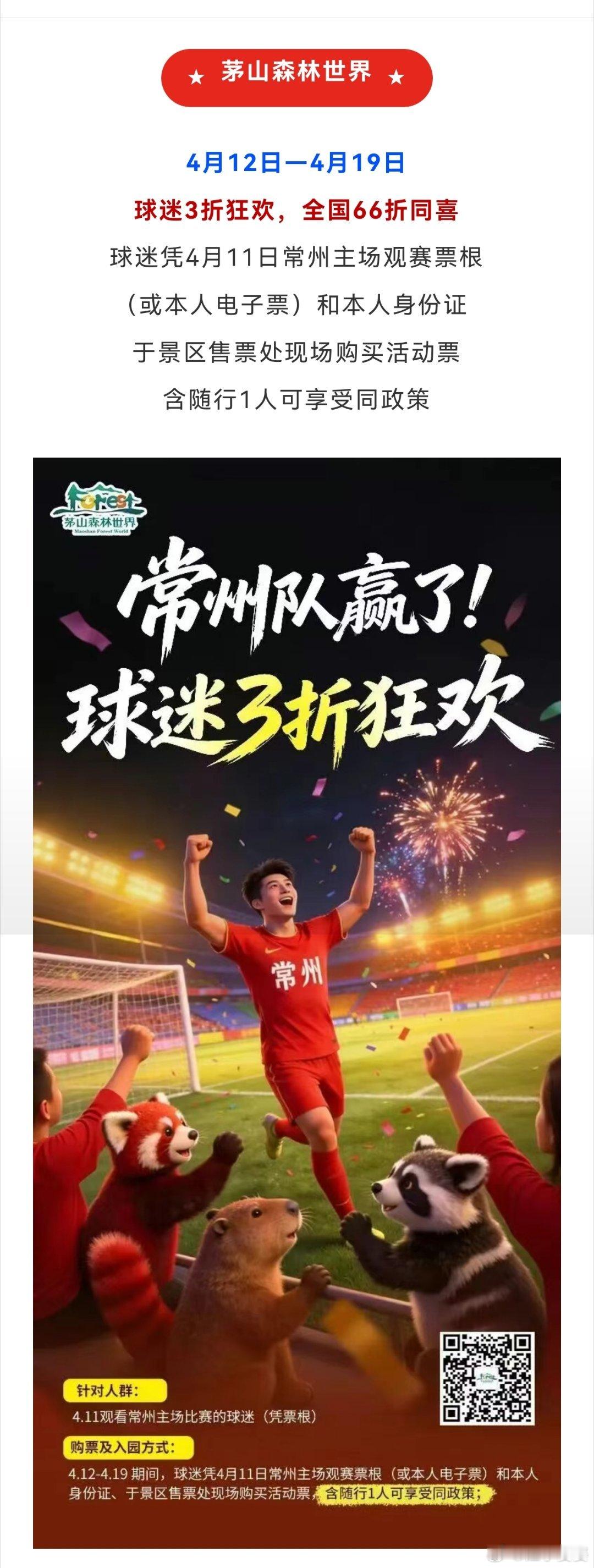 ★茅山森林世界★4月12日—4月19日球迷3折狂欢,全国66折同喜球迷凭4月11日常州主场观赛票根(或本人电子票)和本人身份证于景区售票处现场购买活动票含随行1人可享受同政策