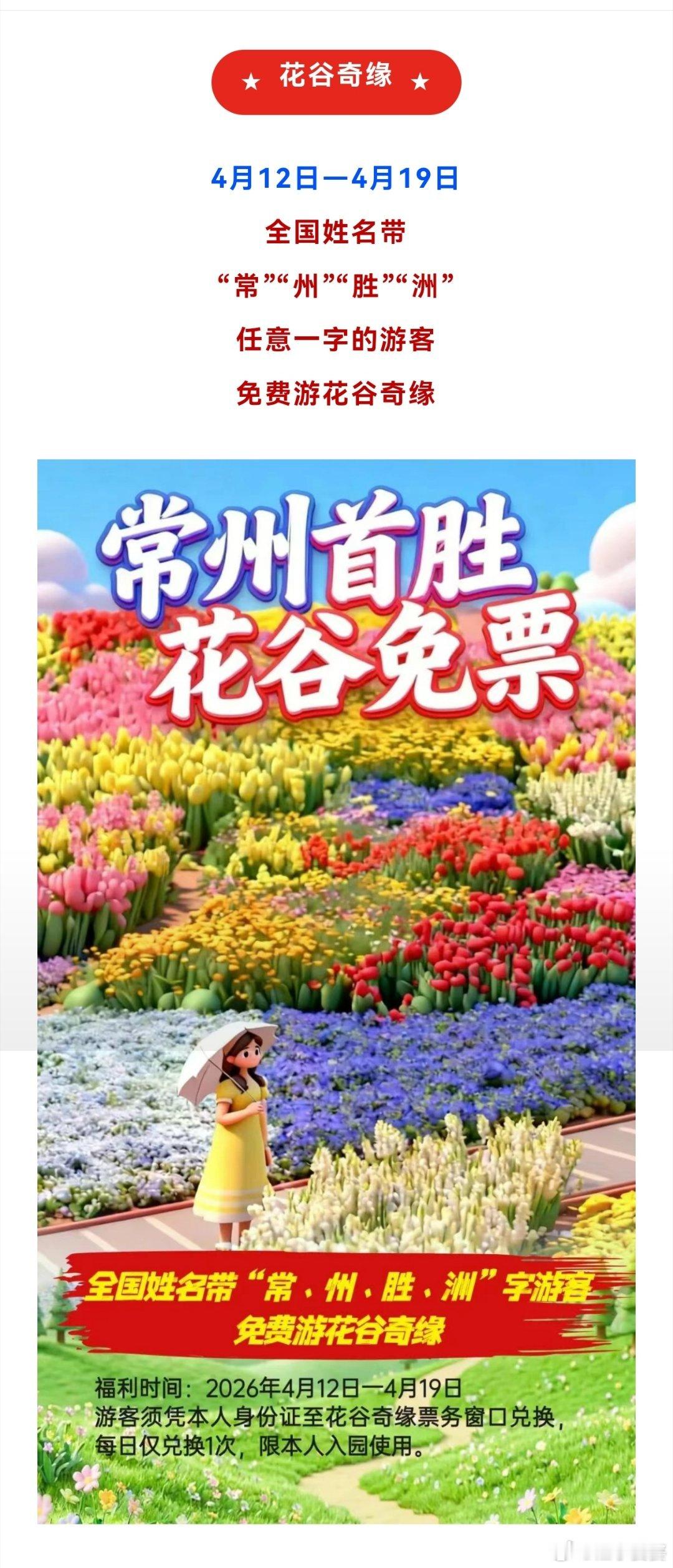 ★花谷奇缘★4月12日—4月19日全国姓名带“常”“州”“胜”“洲”任意一字的游客免费游花谷奇缘