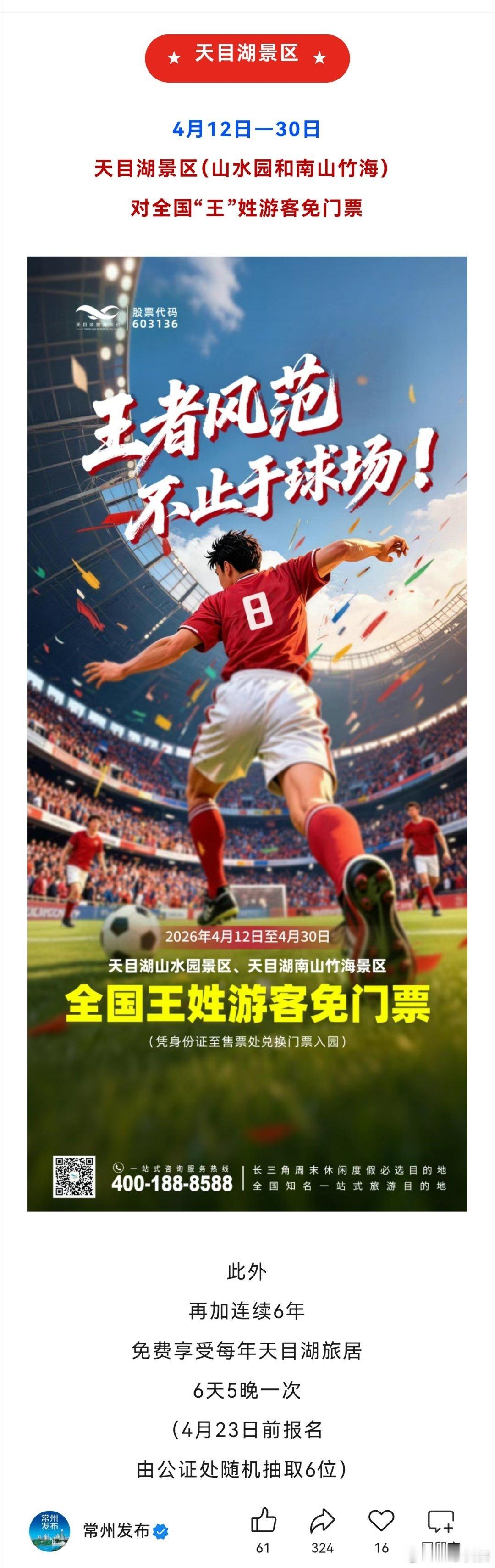 ★天目湖景区★4月12日—30日天目湖景区(山水园和南山竹海)对全国“王”姓游客免门票此外再加连续6年免费享受每年天目湖旅居6天5晚一次(4月23日前报名由公证处随机抽取6位)