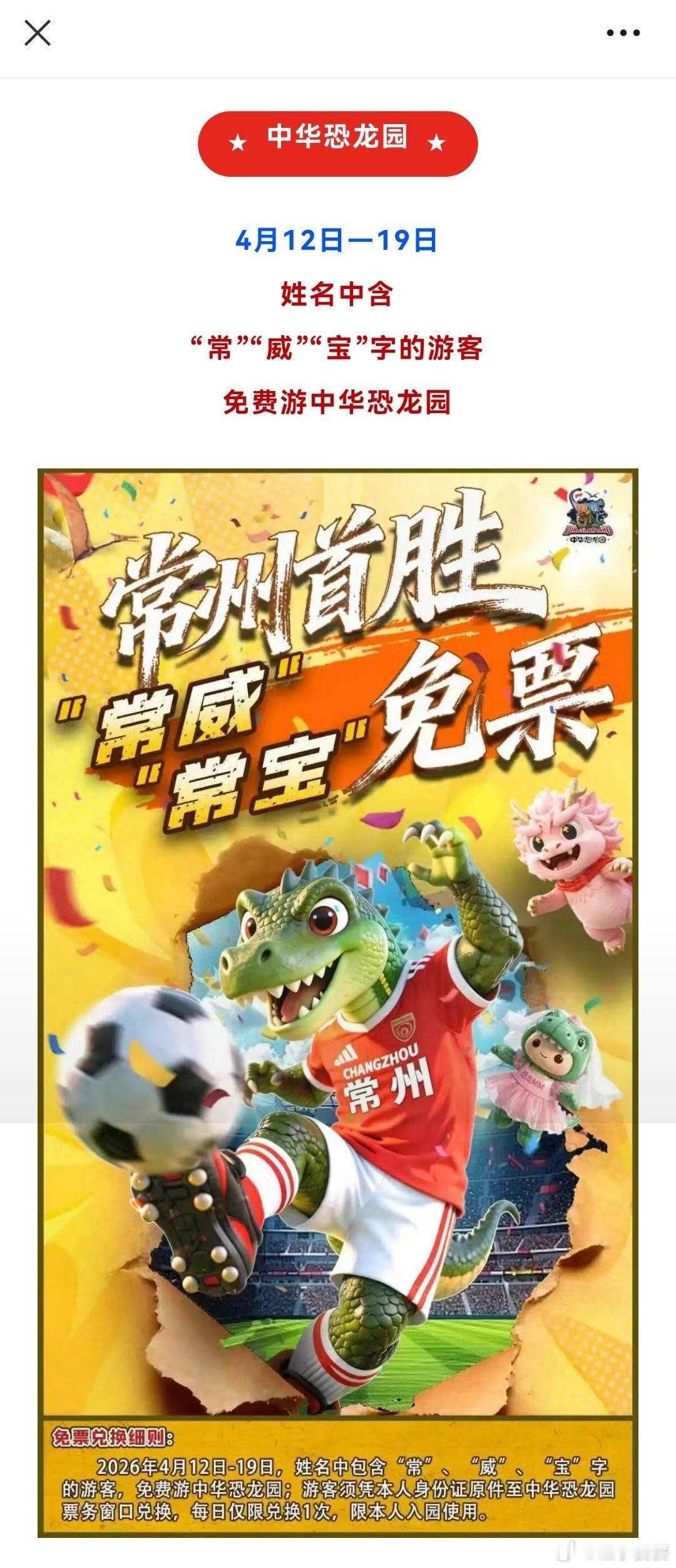★中华恐龙园★4月12日—19日姓名中含“常”“威”“宝”字的游客免费游中华恐龙园