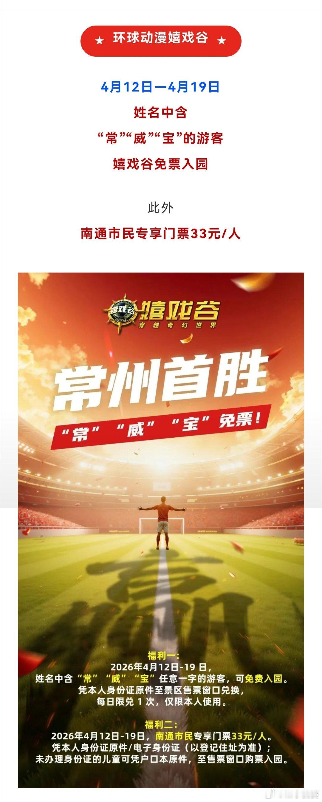 ★环球动漫嬉戏谷★4月12日—4月19日姓名中含“常”“威”“宝”的游客嬉戏谷免票入园此外南通市民专享门票33元/人