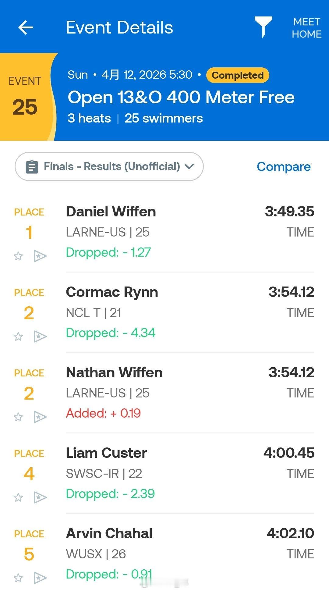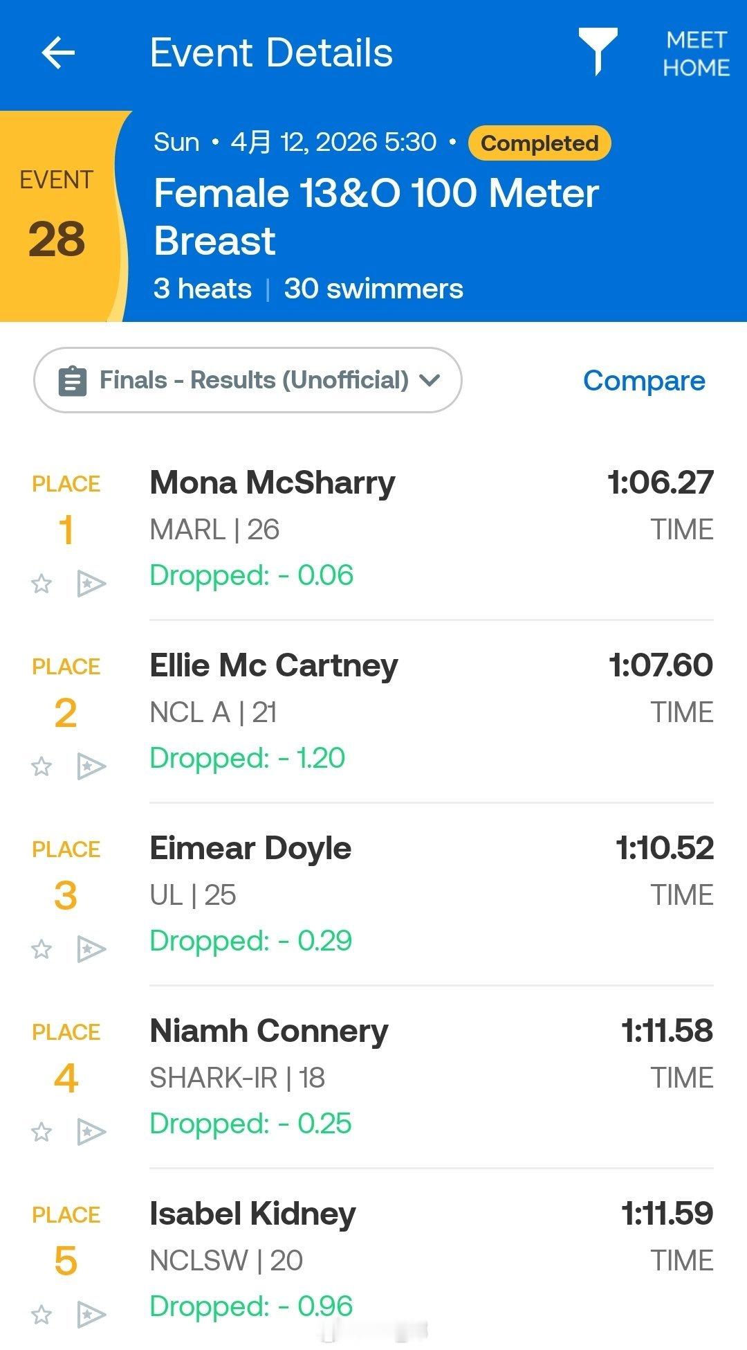 爱尔兰游泳锦标赛 第三天决赛男200仰:John Shortt 1:55.70 NR男400自:Daniel Wiffen 3:49.35女100蛙:Mona McSharry 1:06.27
