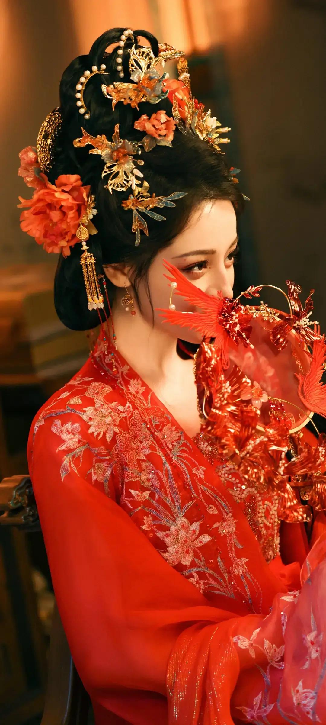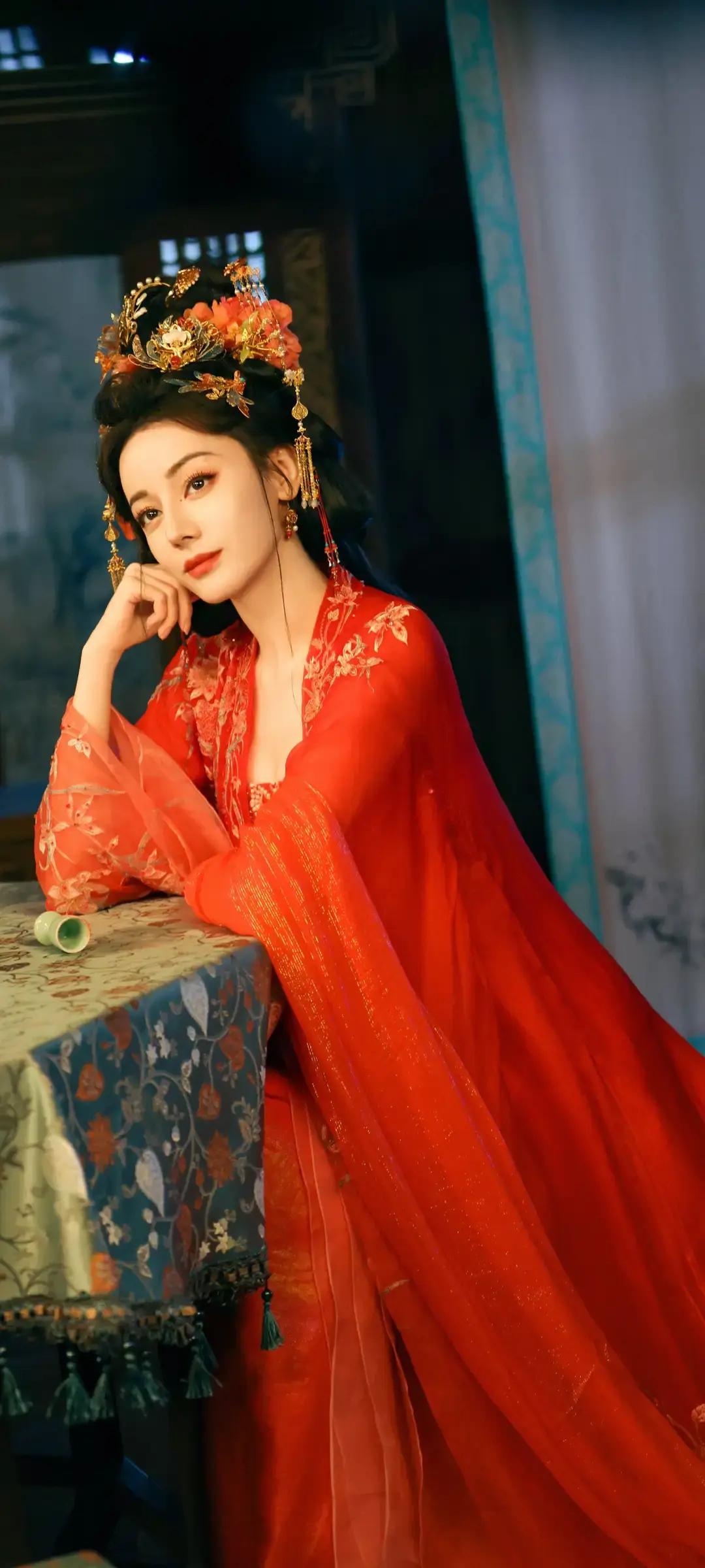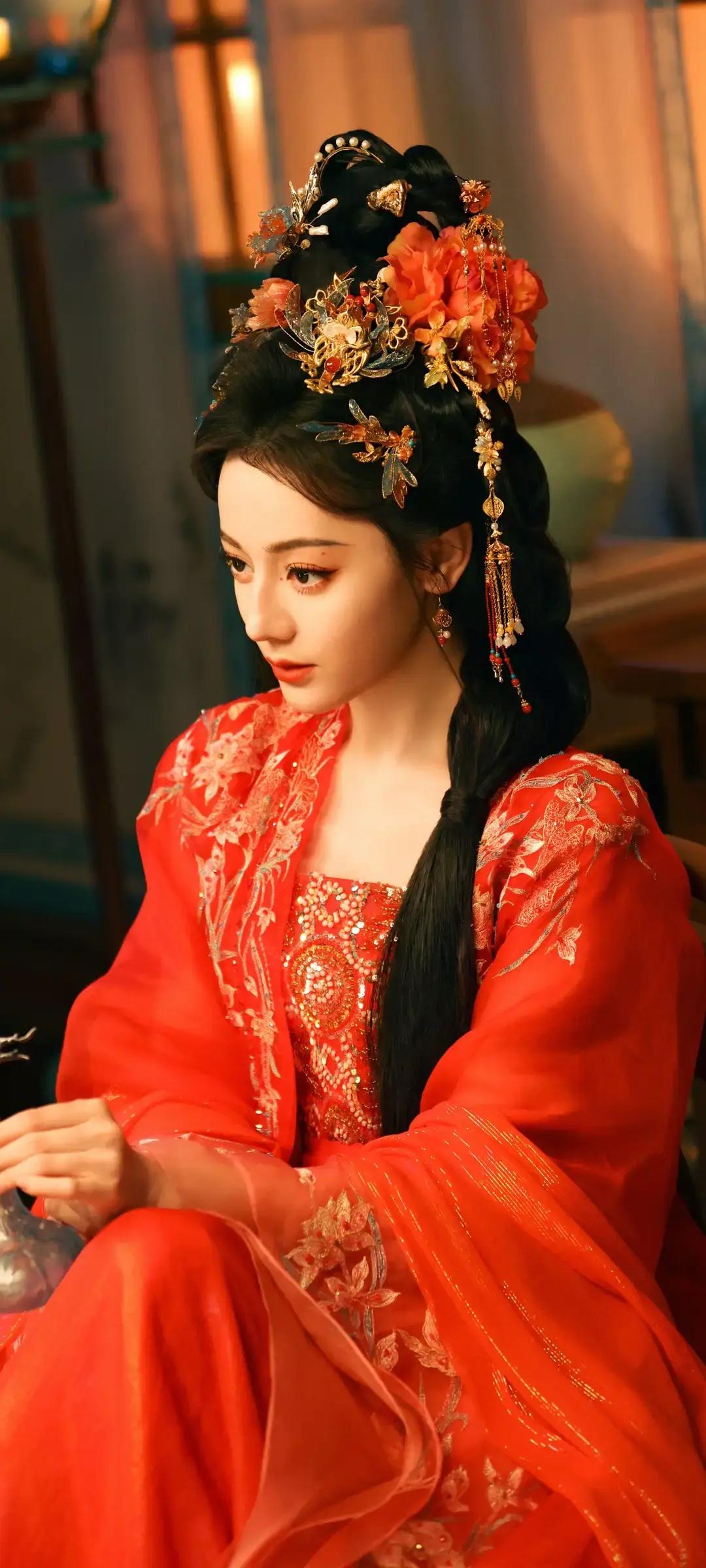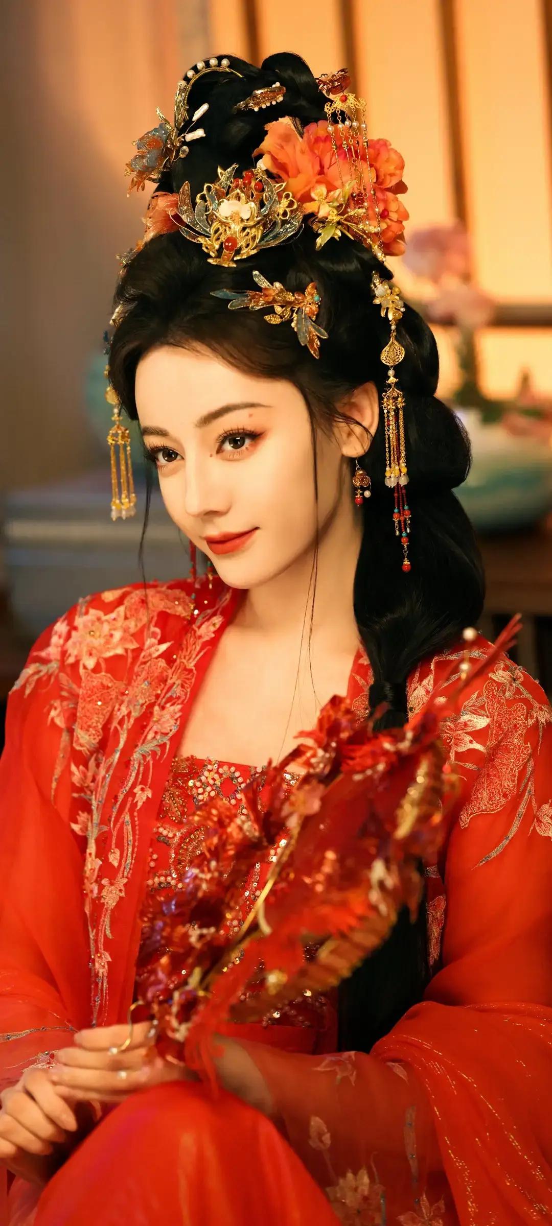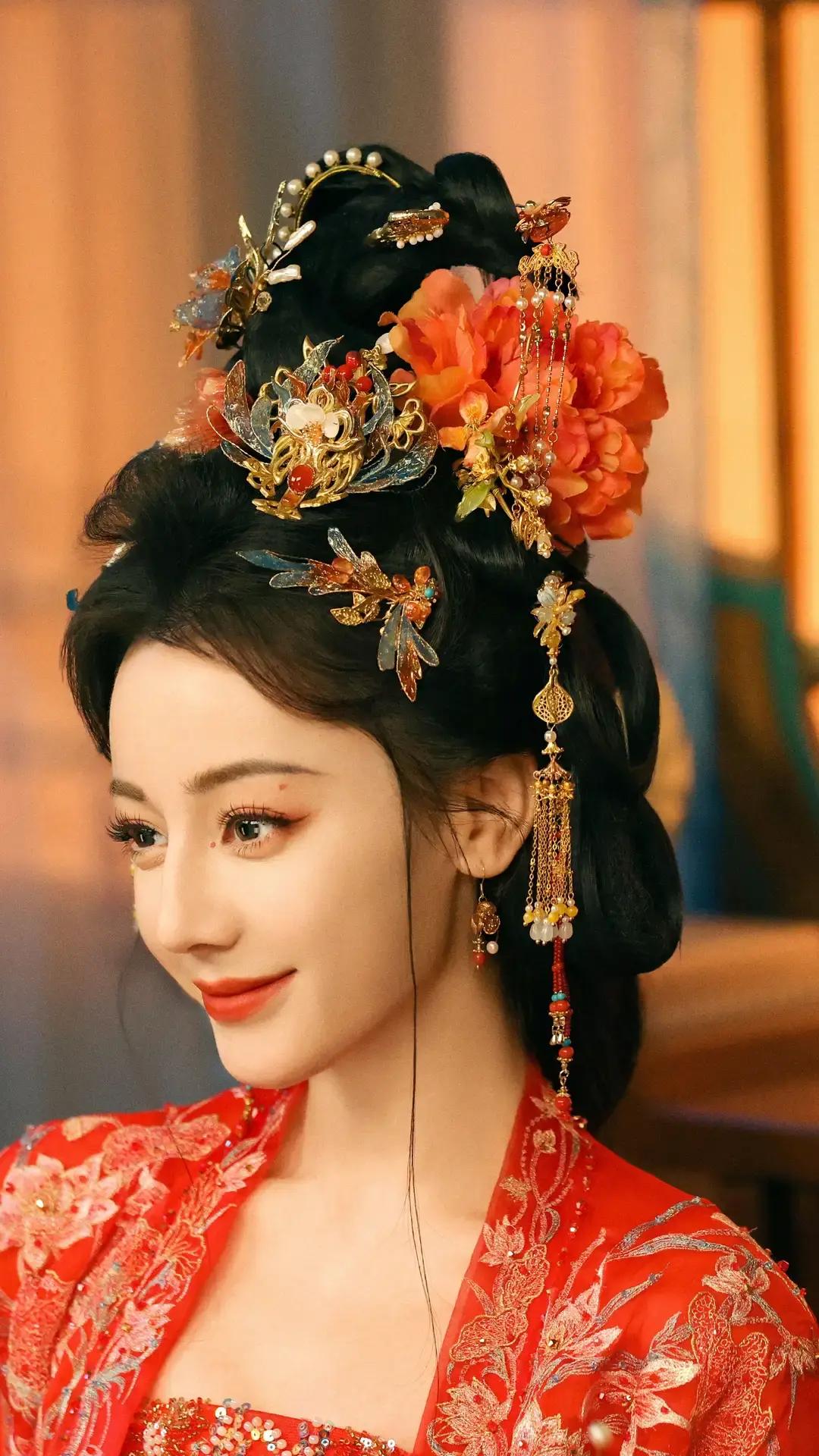 一袭朱红华服,满鬓金饰珠翠,迪丽热巴把中式古典美人的明艳与贵气拿捏得恰到好处