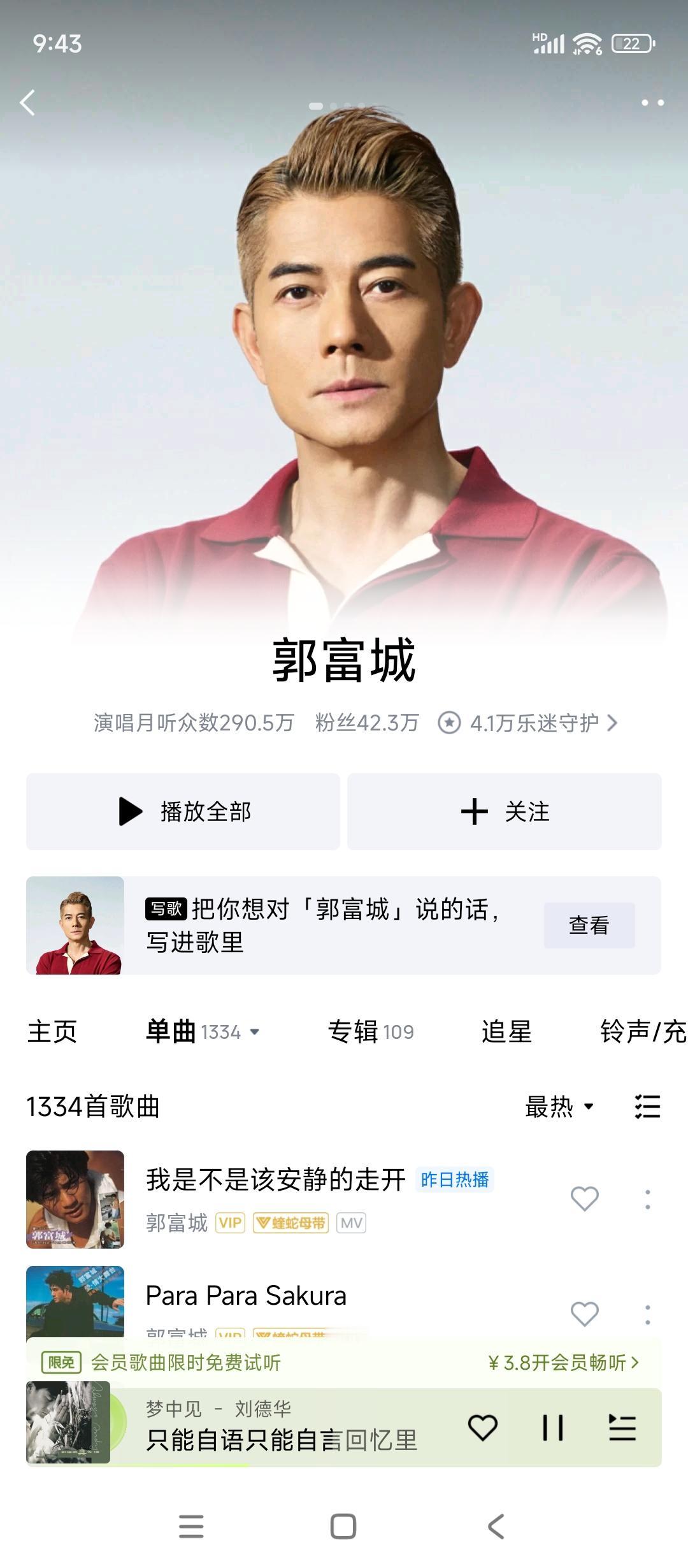 月听众人数,刘德华1289万,张学友1282万,黎明380万,郭富城290万
