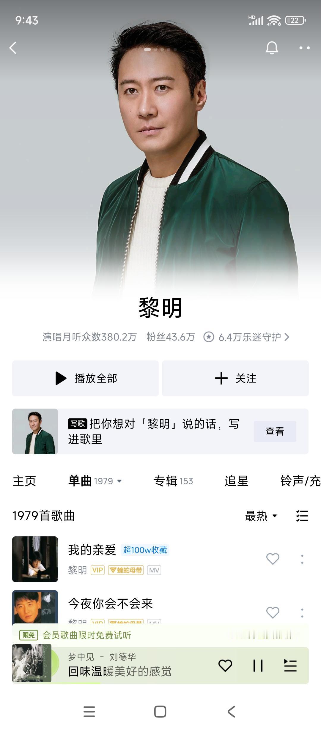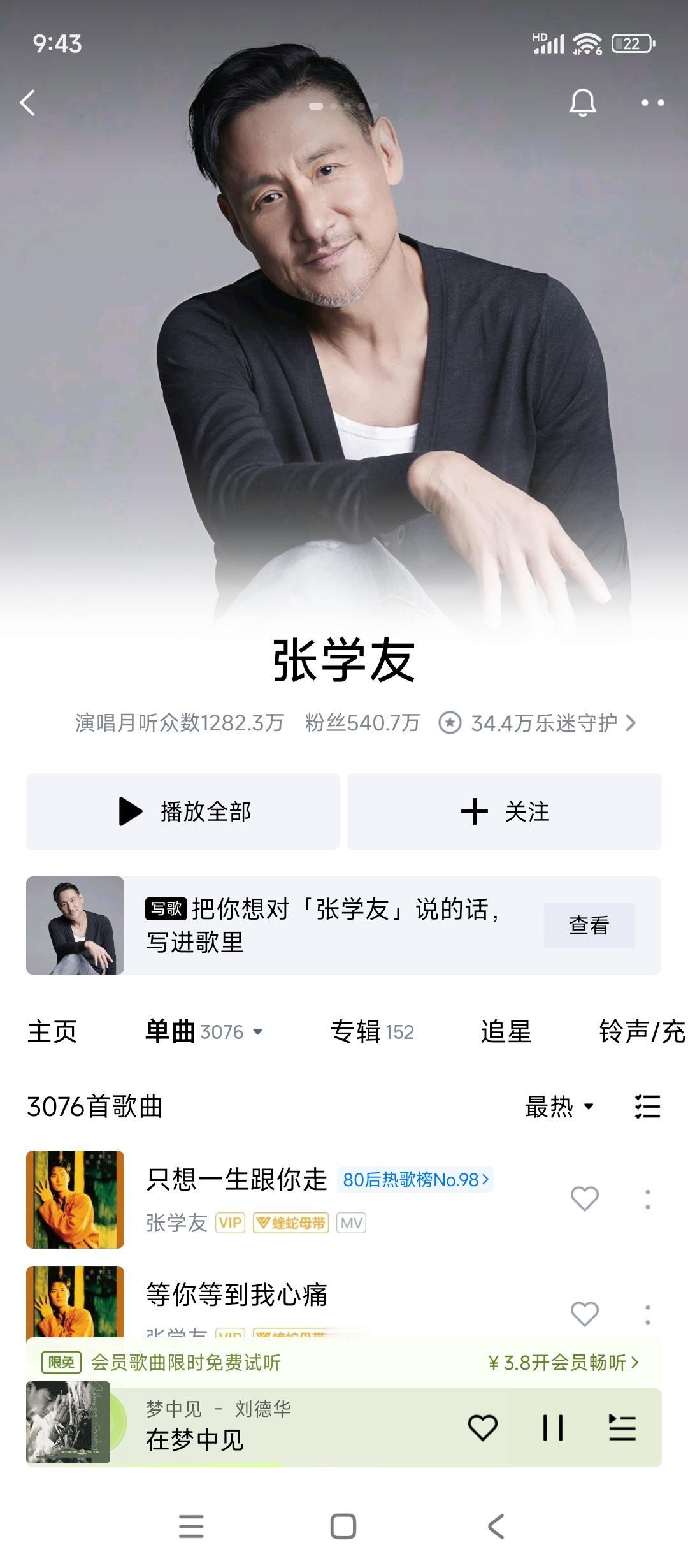 酷狗音乐上今天的数据 歌迷人数,刘德华593.3万,张学友540.7,黎明43.
