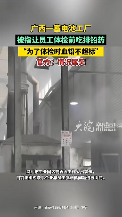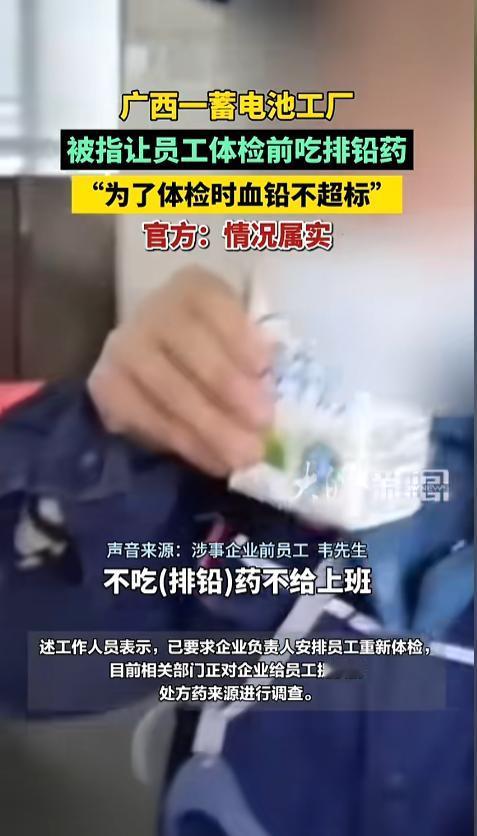 信息来源:《“不吃药不让上班”,广西一企业被指让员工体检前吃排铅药,官方:情况属实》大皖新闻