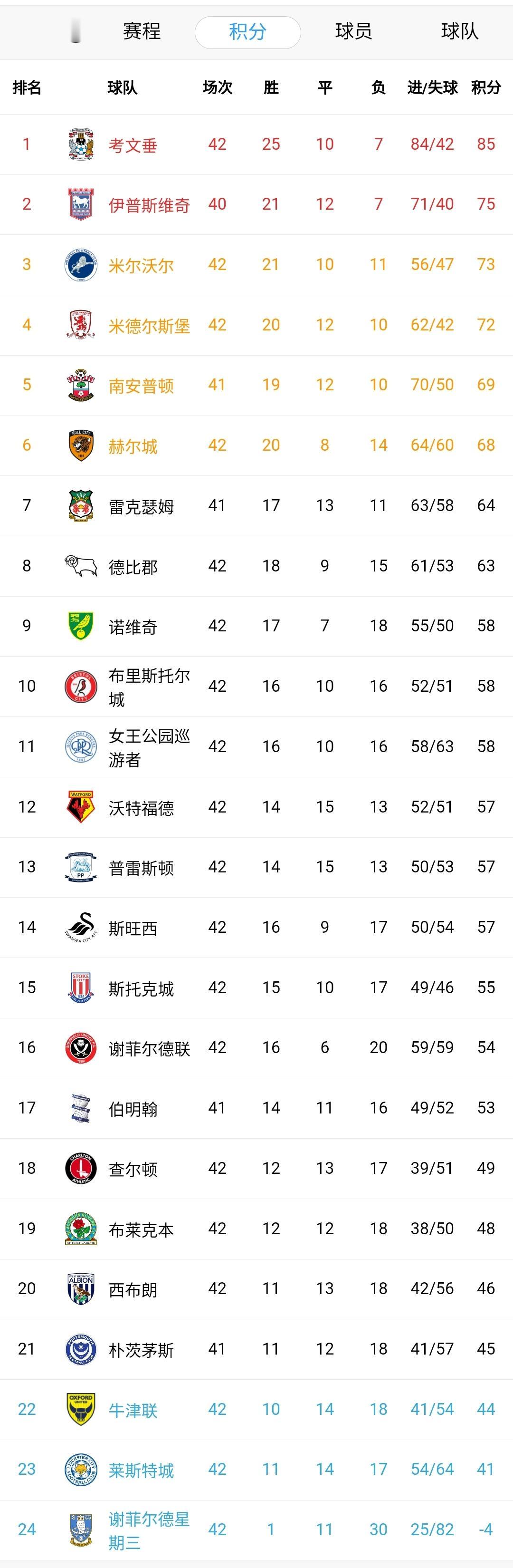一场0-0足以让考文垂低调直升英超;伊普斯维奇2-0击败诺维奇排名第二,比第三多2分,而且它还少赛两场。