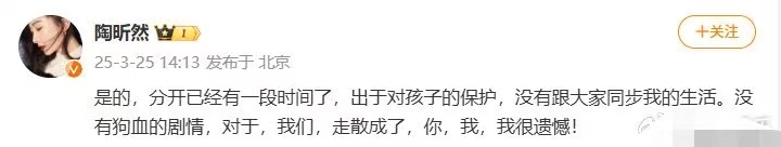 陶昕然居然离婚了昨天看浪姐被陶昕然圈粉了,考古了一下她竟然也离婚了没有狗血互撕,只有体面告别,为保护孩子低调分开。