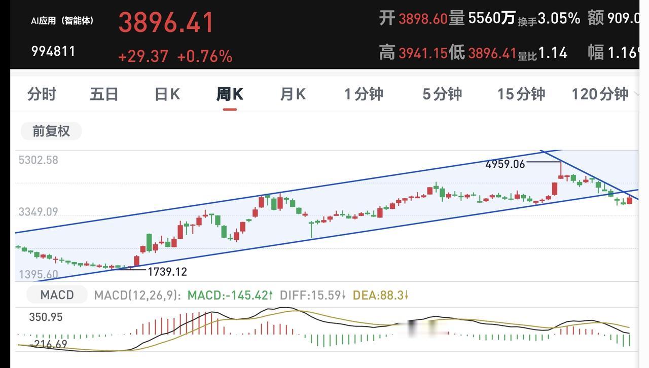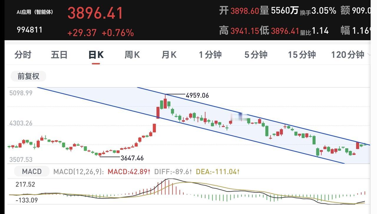 AI应用板块日线级别处于下跌通道中,这个板块上周三上涨到了下跌通道上轨线附近,星期四和星期五在下跌通道上轨线附近震荡,但并没有突破这个下跌通道的上轨线,也就是还没有能够改变这个板块日线级别下跌趋势,短线持有的人需要继续注意风险,但由于现在距离这个上轨线比较近,近期也要观察会不会有效突破这条上轨线,如果能够实现有效突破,短线的人可以进场看多做多。