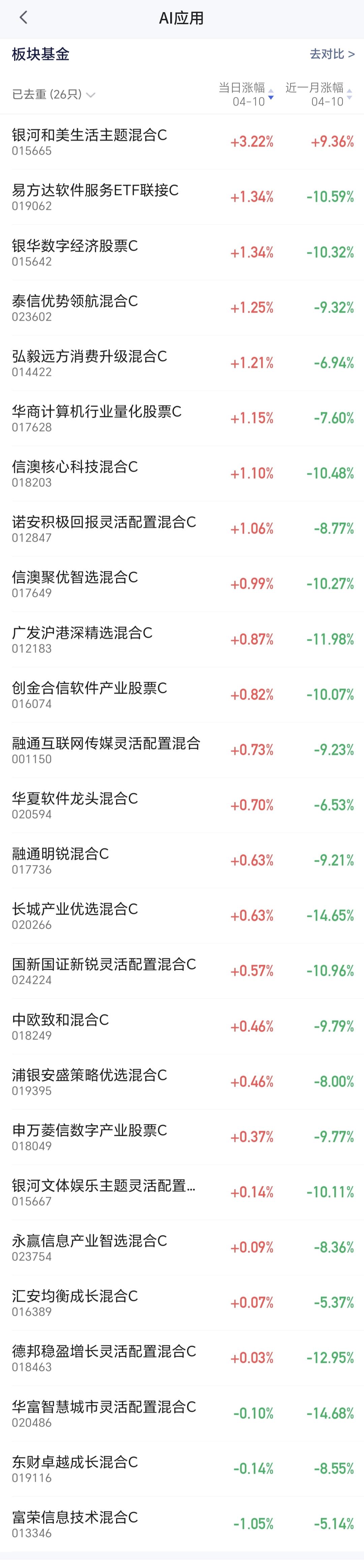 AI应用板块共有26只基金,各只基金的情况见下面的截图6,近一个月以来,这个板块中只有一只基金是上涨的,银河和美生活主题混合在最近一个月当中上涨了9.36%,其他的所有基金都是下跌,华富智慧城市主题下跌了14.68%,是这个板块所有基金当中下跌幅度最大的一只。