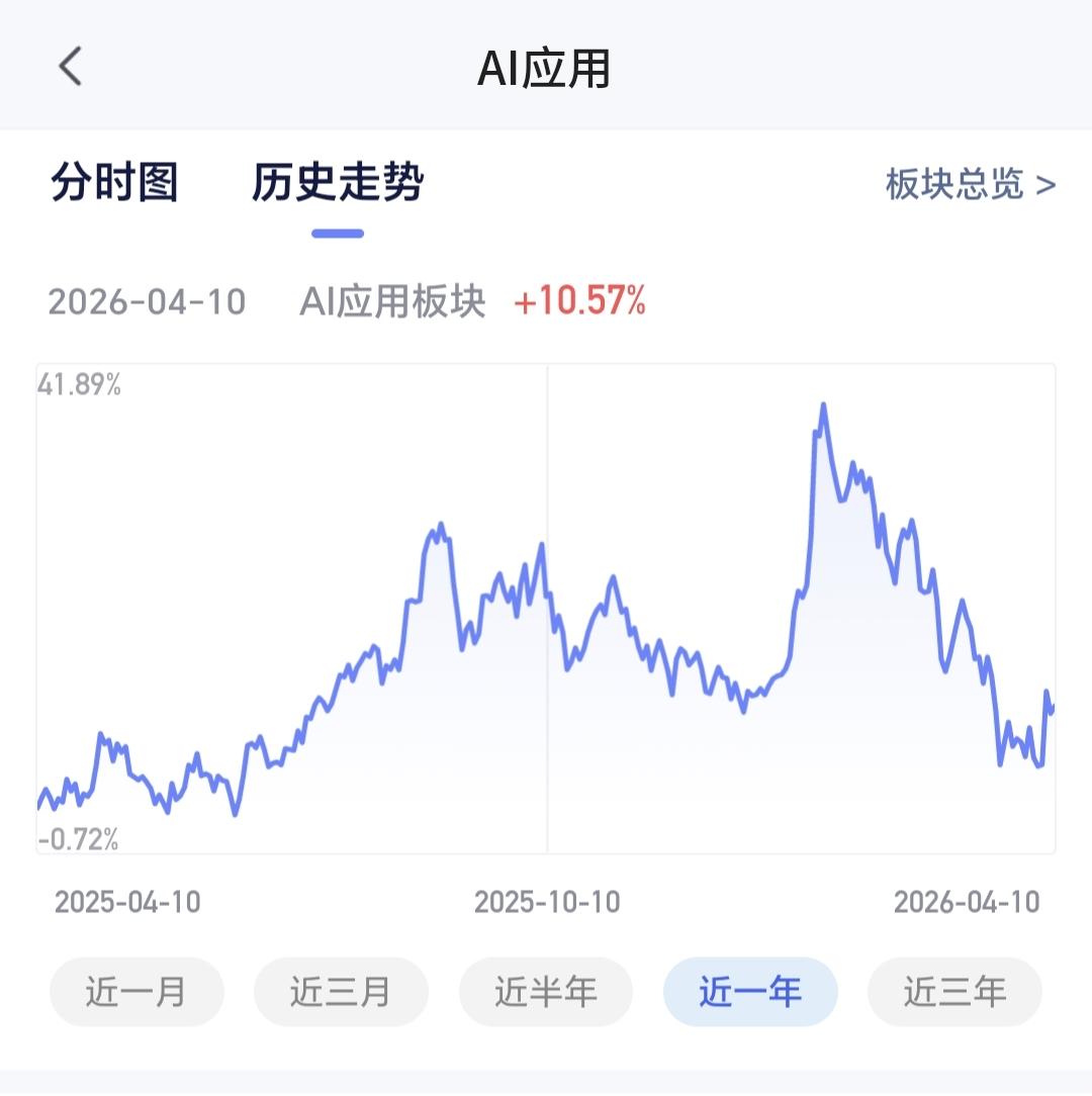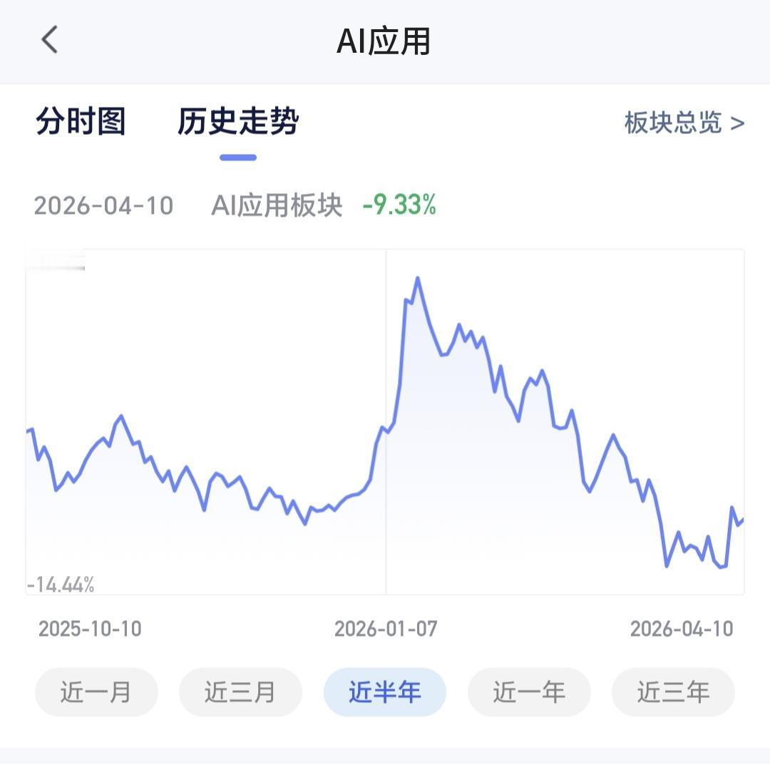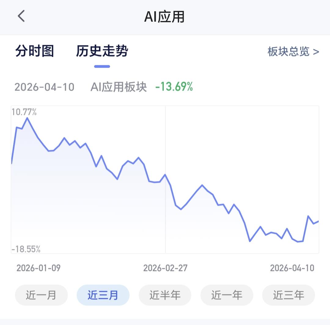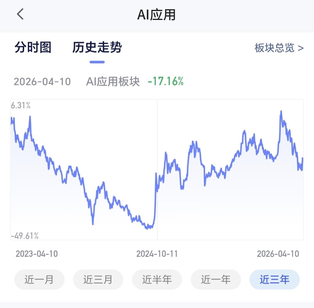 AI应用板块最近三个月下跌了13.69%,近六个月以来下跌了9.33%,近一年以来上涨了10.57%,近三年以来下跌了17.16%,最近几年这个板块的波动其实不大,近三年还是下跌状态,说明这个板块的位置并不高,这也是我选择了一只基金在进行定投的主要原因。