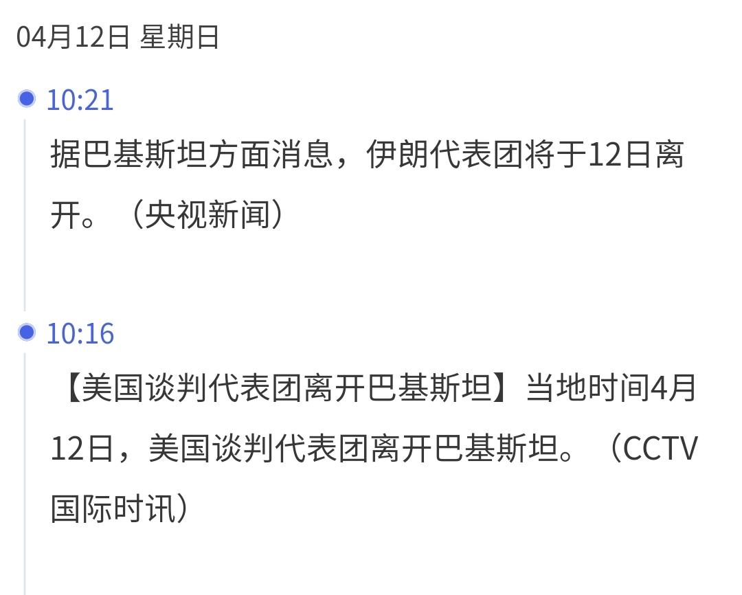 据有关方面的消息,美国和伊朗的谈判已经失败,双方都将在今天离开巴基斯坦,但我认为,在他们上飞机之前,都还存在回旋的余地,不排除会从机场返回到谈判桌上,这样的概率很大,中断谈判离开巴基斯坦,只是谈判策略的一部分,你觉得今天他们会不会重新回到谈判桌上?你觉得今天他们再次进行谈判的可能性大不大?不管你认为的可能性大不大,反正我认为可能性很大,最大的可能性就是从机场返回到谈判桌上。