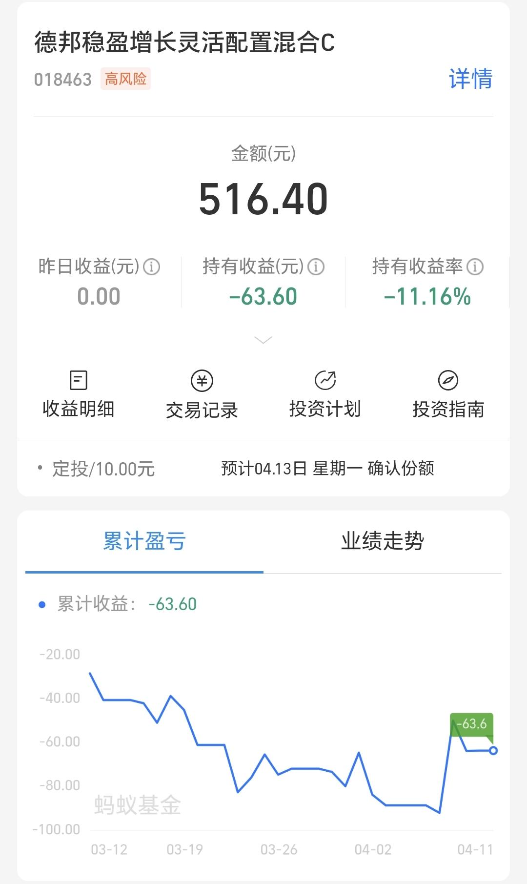 AI应用板块基金我持有516元,持有亏损63元,持有亏损率11.16%,累计亏损也是63元,每天定投10块钱。