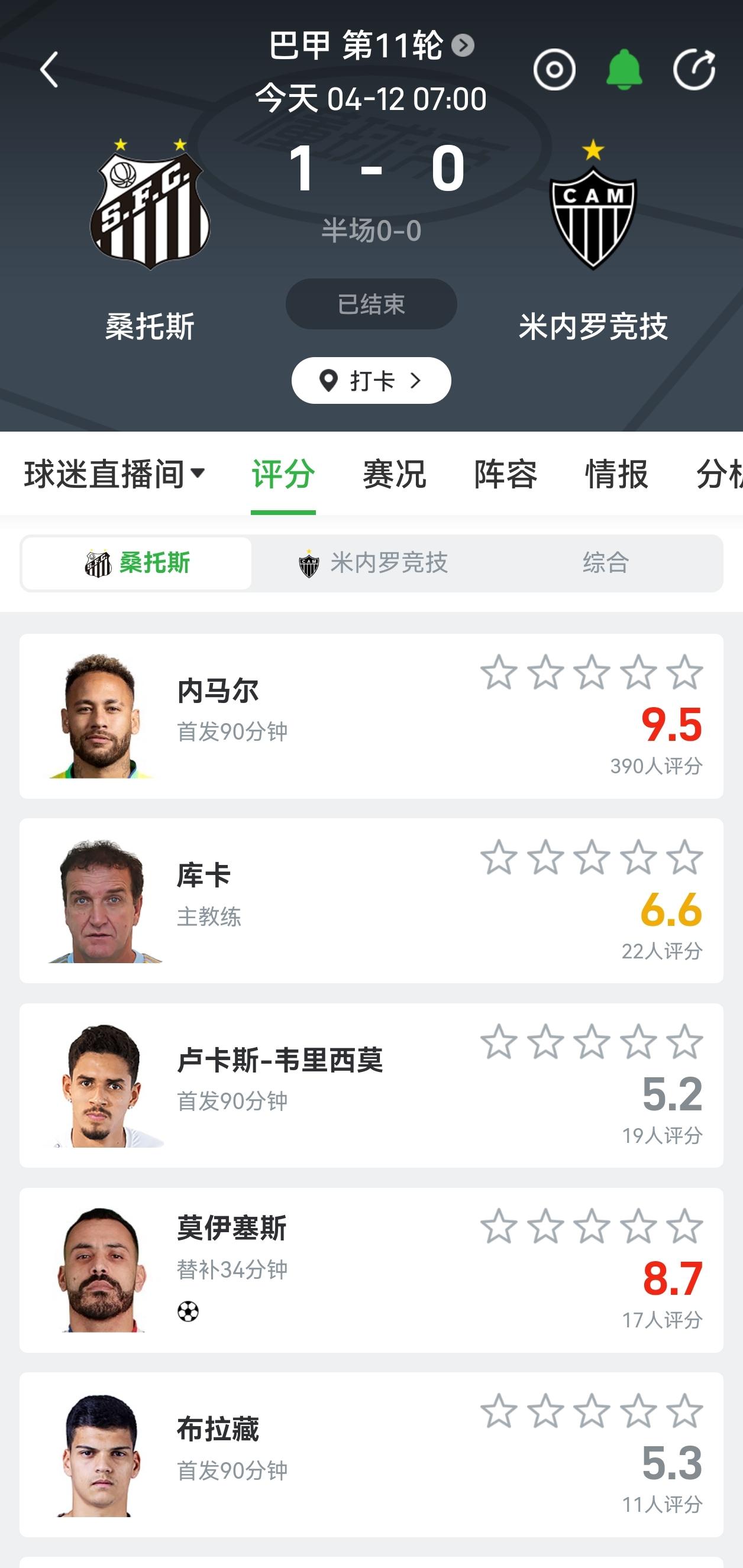 恭喜恭喜 率领的桑托斯 1-0米内罗竞技,莫伊塞斯打入制胜球。