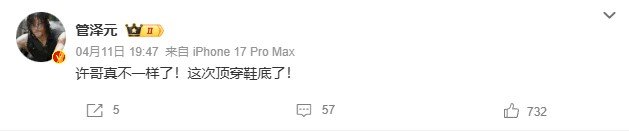 赛后,资深解说管泽元也忍不住发博惊叹:许哥真不一样了!这次真的是顶穿鞋底了!