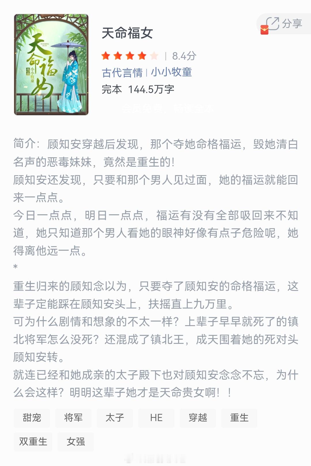 《天命福女》作者:小小牧童顾知安穿越后发现,那个夺她命格福运,毁她清白名声的恶毒妹妹,竟然是重生的!顾知安还发现,只要和那个男人见过面,她的福运就能回来一点点。今日一点点,明日一点点,福运有没有全部吸回来不知道,她只知道那个男人看她的眼神好像有点子危险呢,她得离他远一点。重生归来的顾知念以为,只要夺了顾知安的命格福运,这辈子定能踩在顾知安头上,扶摇直上九万里。可为什么剧情和想象的不太一样?上辈子早早就死了的镇北将军怎么没死?还混成了镇北王,成天围着她的死对头顾知安转。就连已经和她成亲的太子殿下也对顾知安念念不忘,为什么会这样?明明这辈子她才是天命贵女啊!!我的私人宝藏书单 这本小说超绝