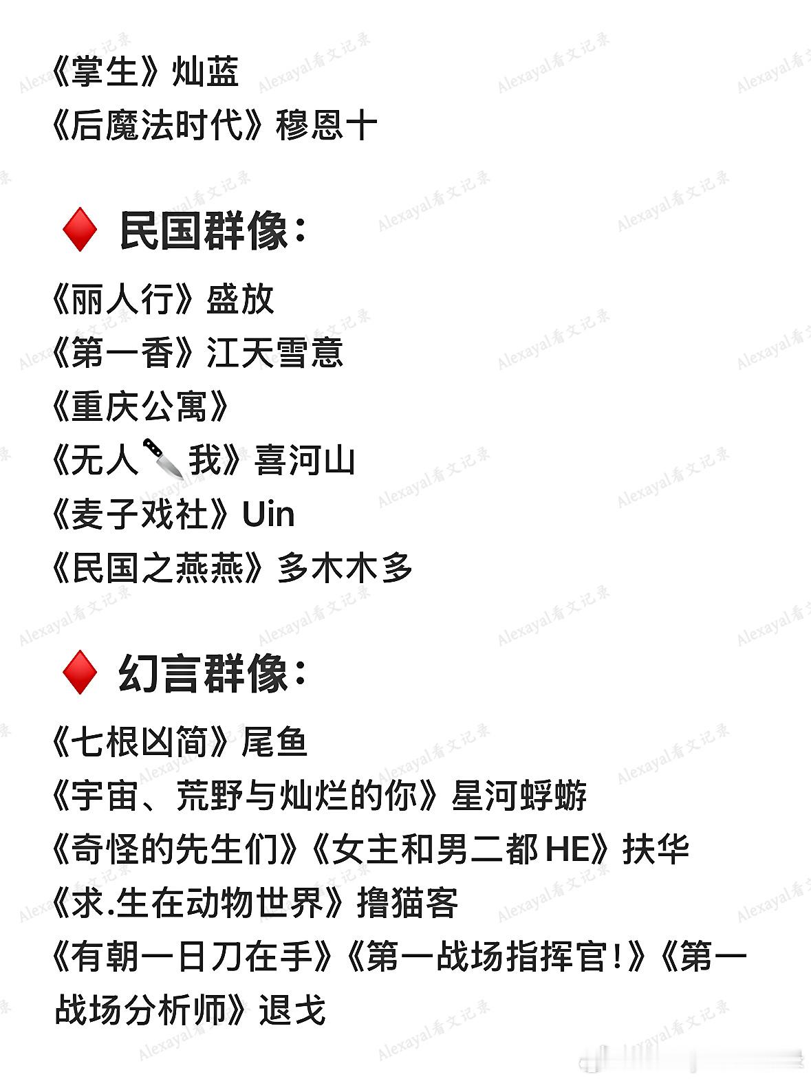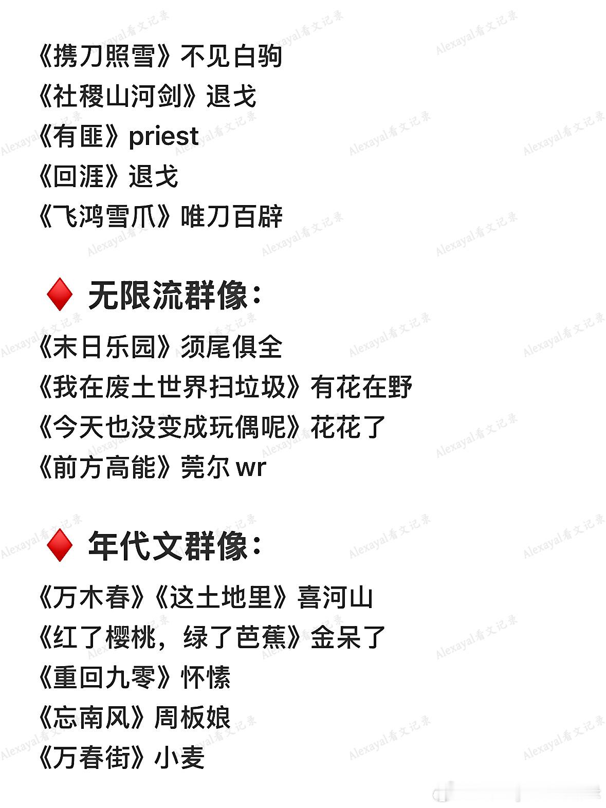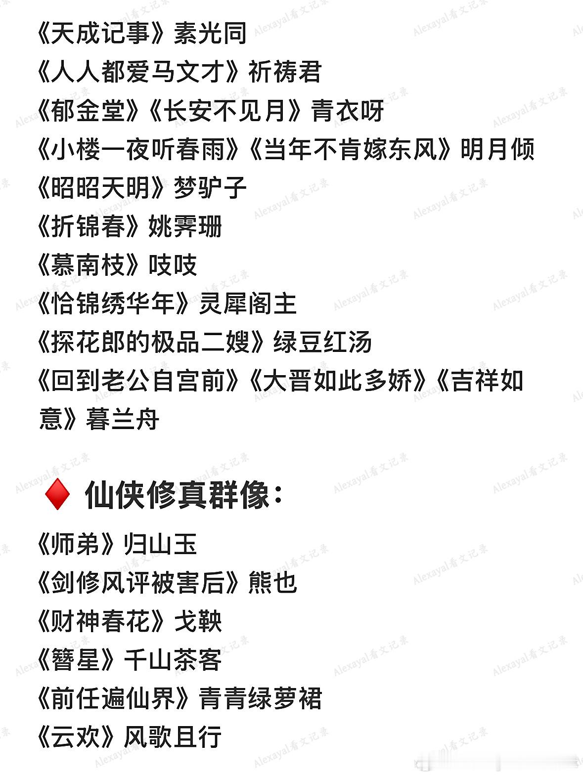 ♦️ 仙侠修真群像:《师弟》归山玉《剑修风评被害后》熊也《财神春花》戈鞅《簪星》千山茶客《前任遍仙界》青青绿萝裙《云欢》风歌且行《女儿骨》虫《仙灵图谱》云芨《师父他太难了》扶华《青云之上》莲花郎面《魇师》黎青燃《从长生苟到飞升》小时你个渣渣