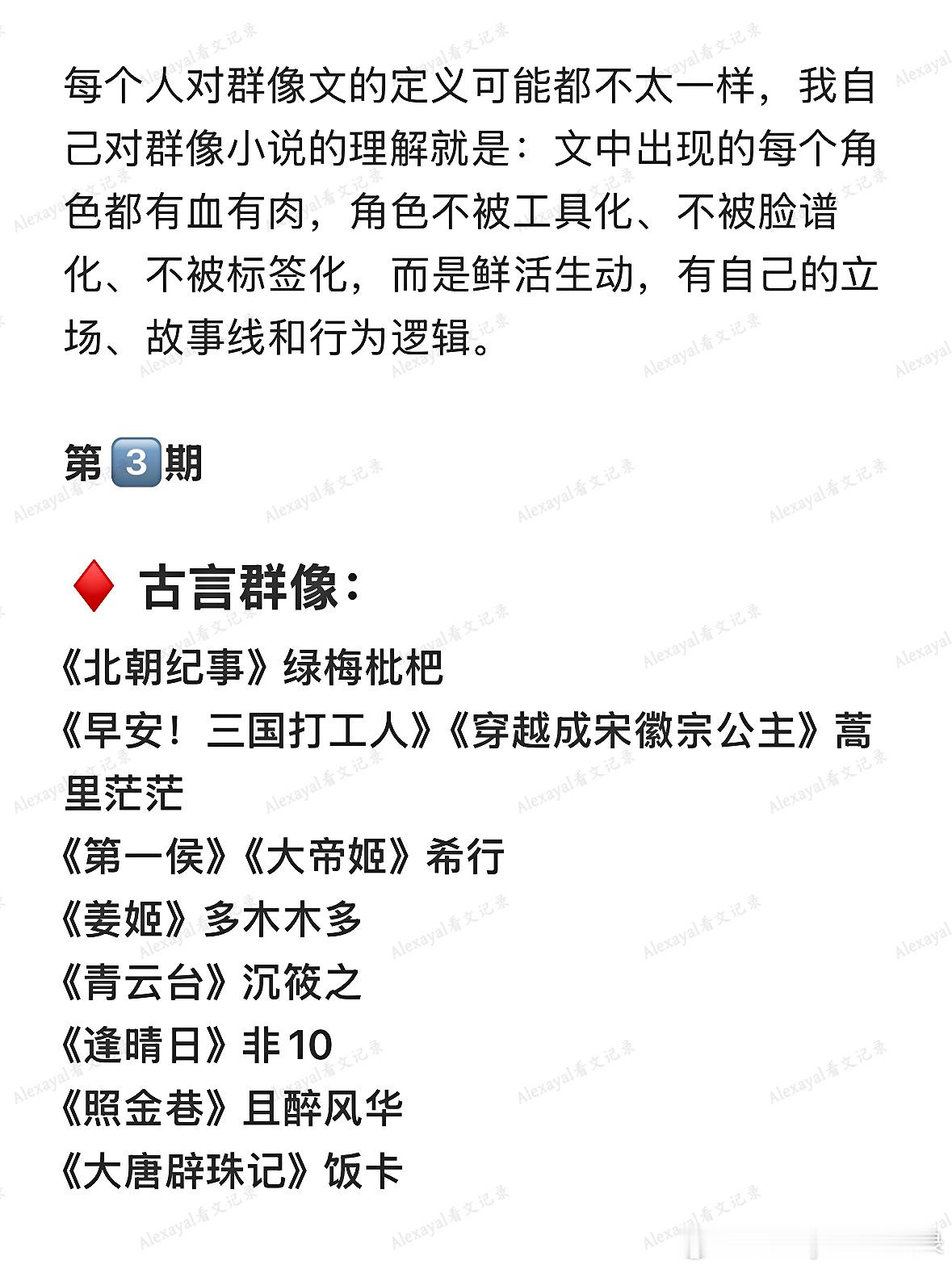 ♦️ 古言群像:《北朝纪事》绿梅枇杷《早安!三国打工人》《穿越成宋徽宗公主》蒿里茫茫《第一侯》《大帝姬》希行《姜姬》多木木多《青云台》沉筱之《逢晴日》非10《照金巷》且醉风华《大唐辟珠记》饭卡《天成记事》素光同《人人都爱马文才》《木兰无长兄》祈祷君《郁金堂》《长安不见月》青衣呀《当年不肯嫁东风》明月倾《昭昭天明》梦驴子《折锦春》姚霁珊《盛华》《墨桑》闲听落花《慕南枝》吱吱《买活》御井烹香《恰锦绣华年》灵犀阁主《探花郎的极品二嫂》绿豆红汤《回到老公自宫前》《大晋如此多娇》《吉祥如意》暮兰舟