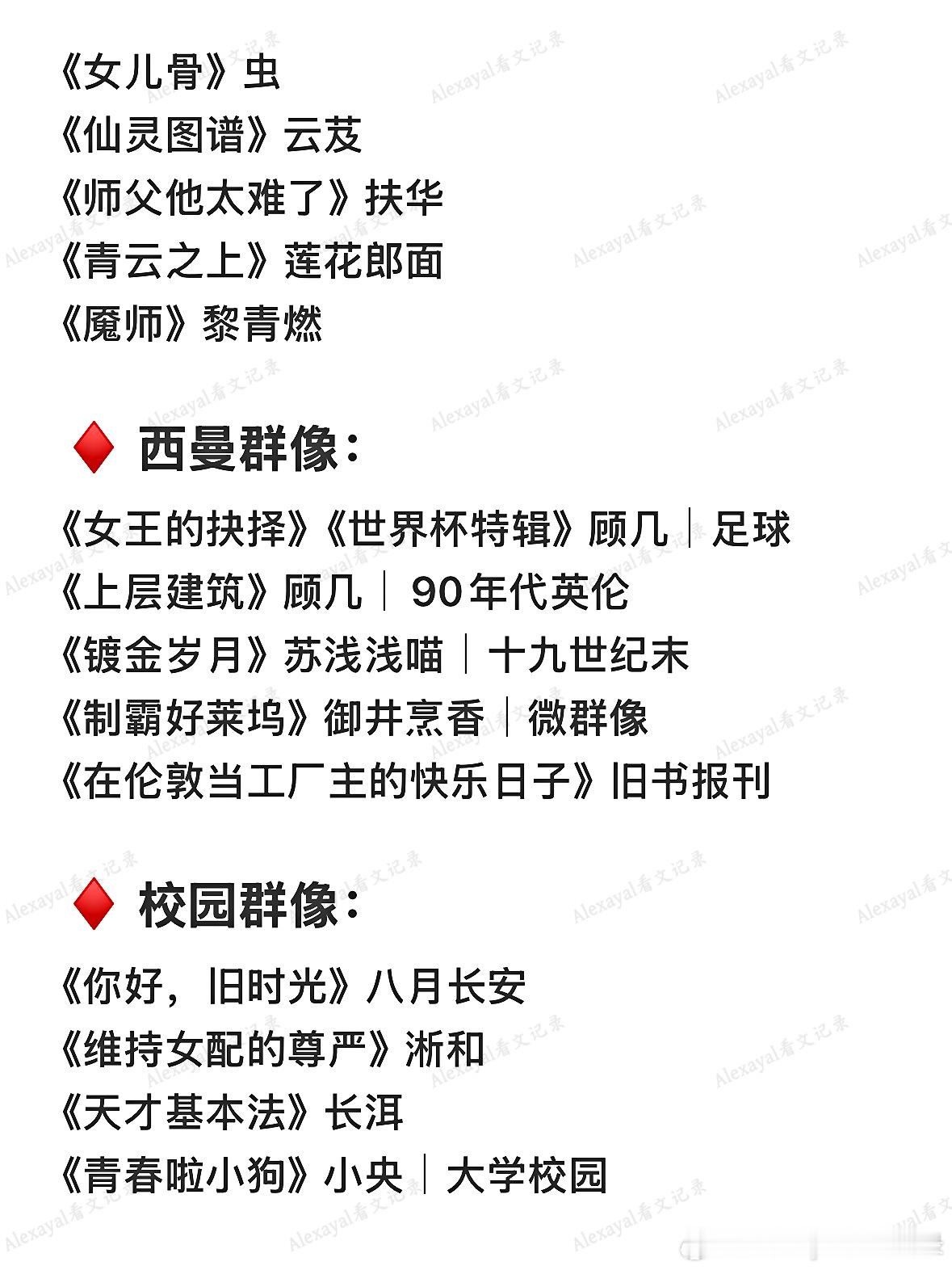 ♦️ 校园群像:《你好,旧时光》八月长安《维持女配的尊严》淅和《天才基本法》长洱《青春啦小狗》小央|大学校园《君子坦荡荡 小人长嘤嘤》坡西米《女校》孩子帮