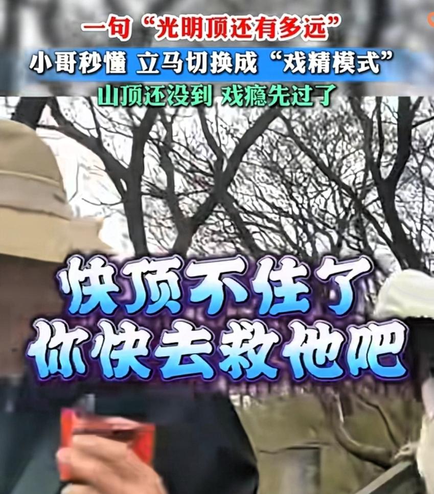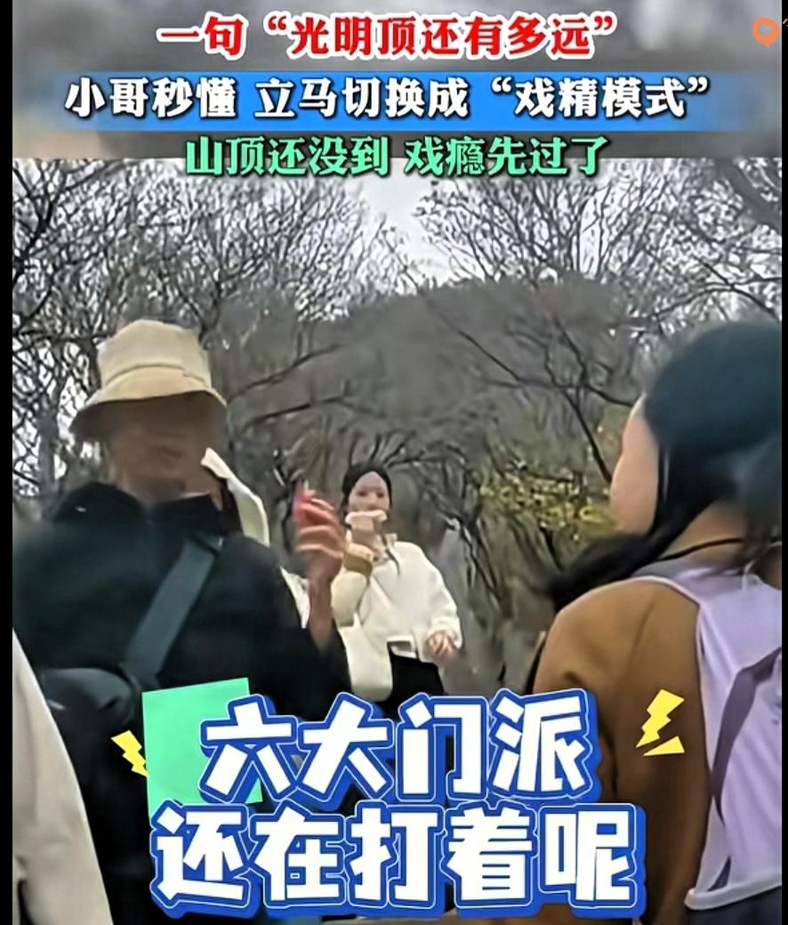 女子爬山随口问光明顶还有多远,陌生小哥不仅秒接梗,还顺着剧情往下演,一句“六大门派还在打”直接把氛围感拉满。