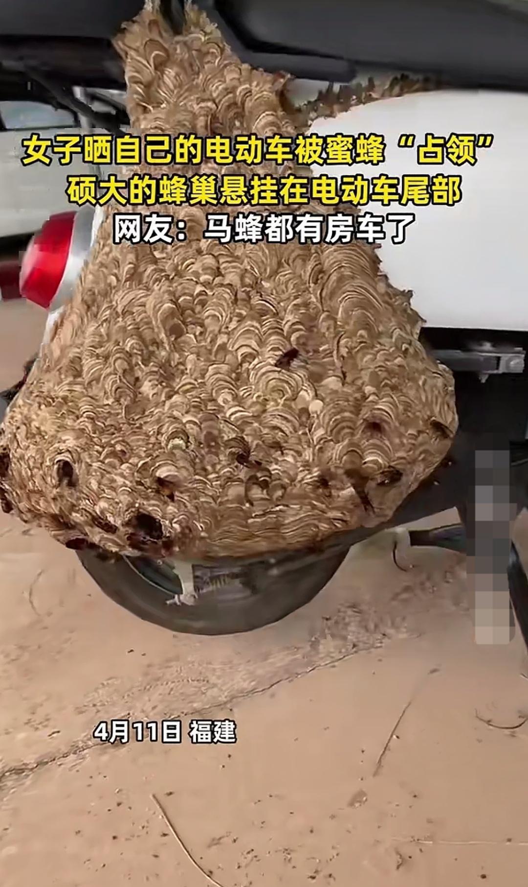 隔了一阵子没骑的电动车,竟被蜂群当成了家。瞧那后轮旁突出的几个大蜂巢,还有在洞眼间飞进飞出的马蜂,着实令人心生后怕。要是被它蜇到,那可就麻烦了!