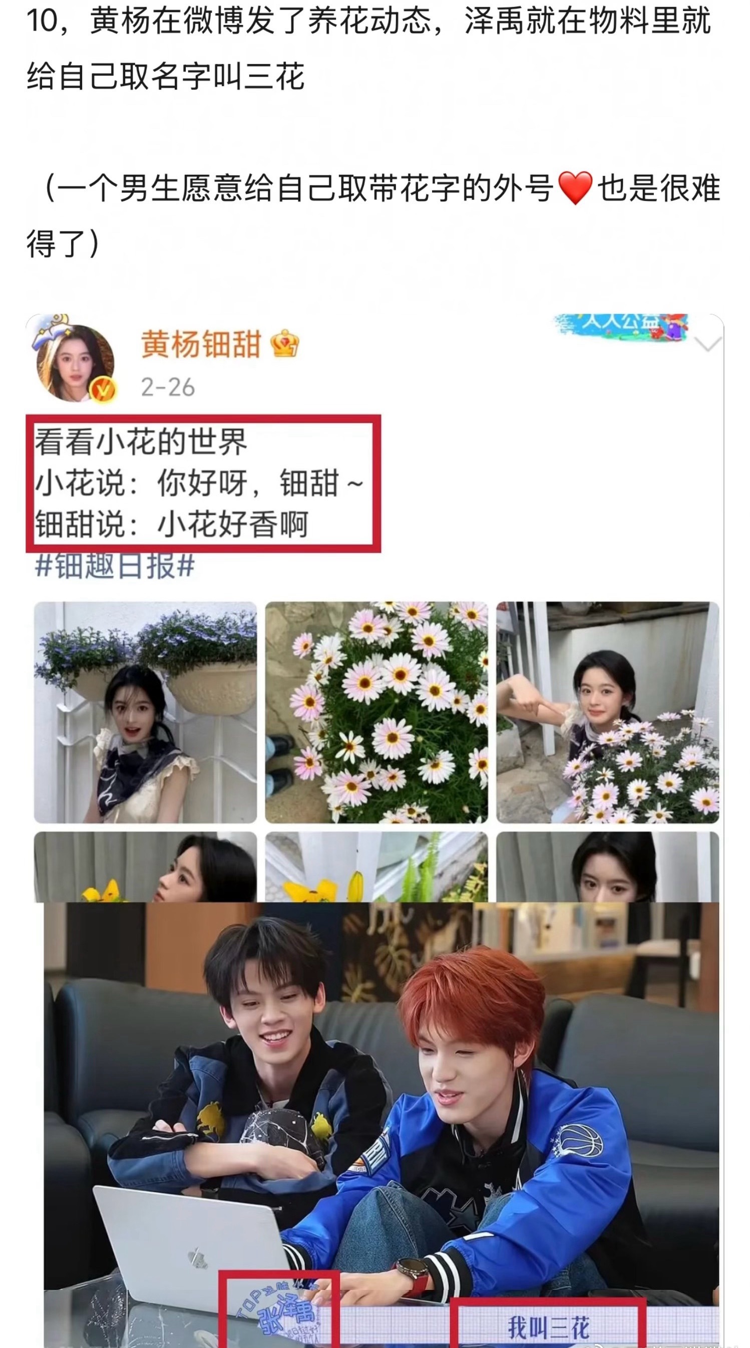 10,黄杨发养花动态喊“小花”,张泽禹在物料里给自己取外号“三花”,用花字呼应