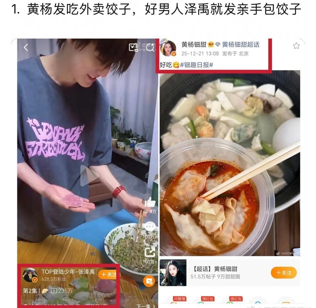 1,黄杨钿甜晒外卖饺子,张泽禹立刻晒亲手包饺子;