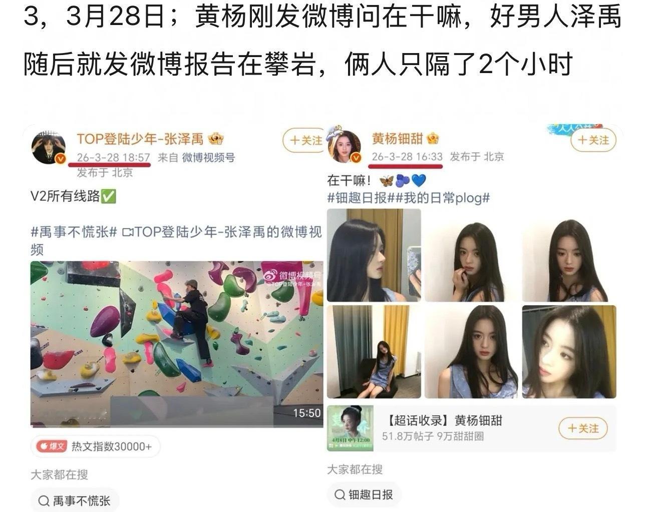 3,黄杨3.28发微博问“在干嘛”,仅隔2小时,张泽禹就发攀岩vlog隔空互动;