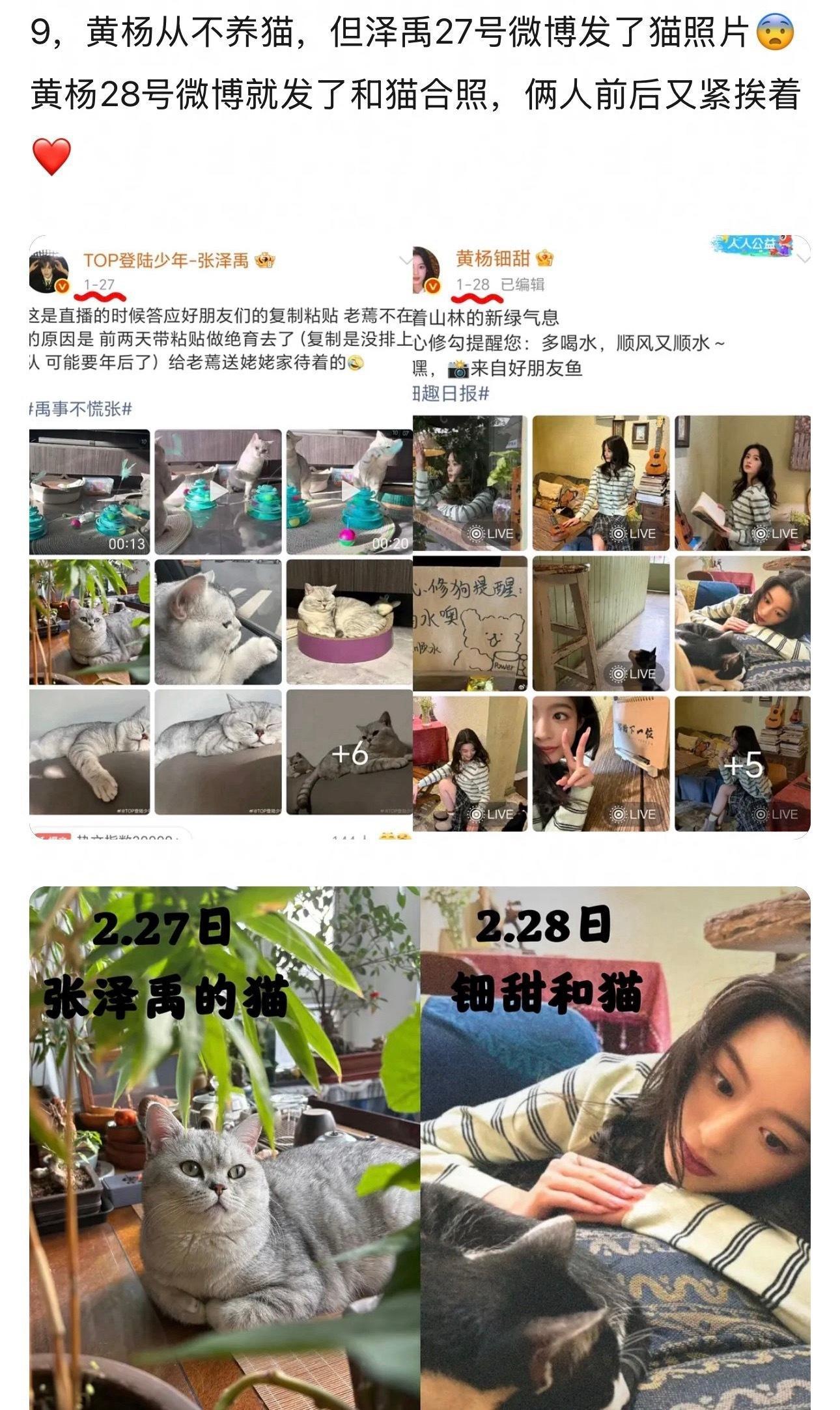 9,张泽禹27号发猫照,从不养猫的黄杨28号就发了和猫的合照;