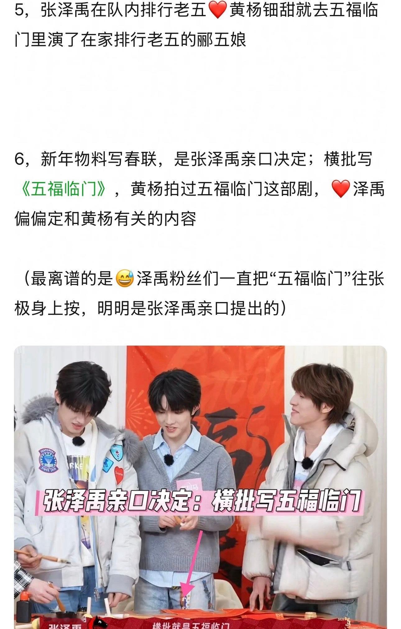 6,新年写春联,张泽禹亲口指定横批“五福临门”,精准对应黄杨的热播剧;