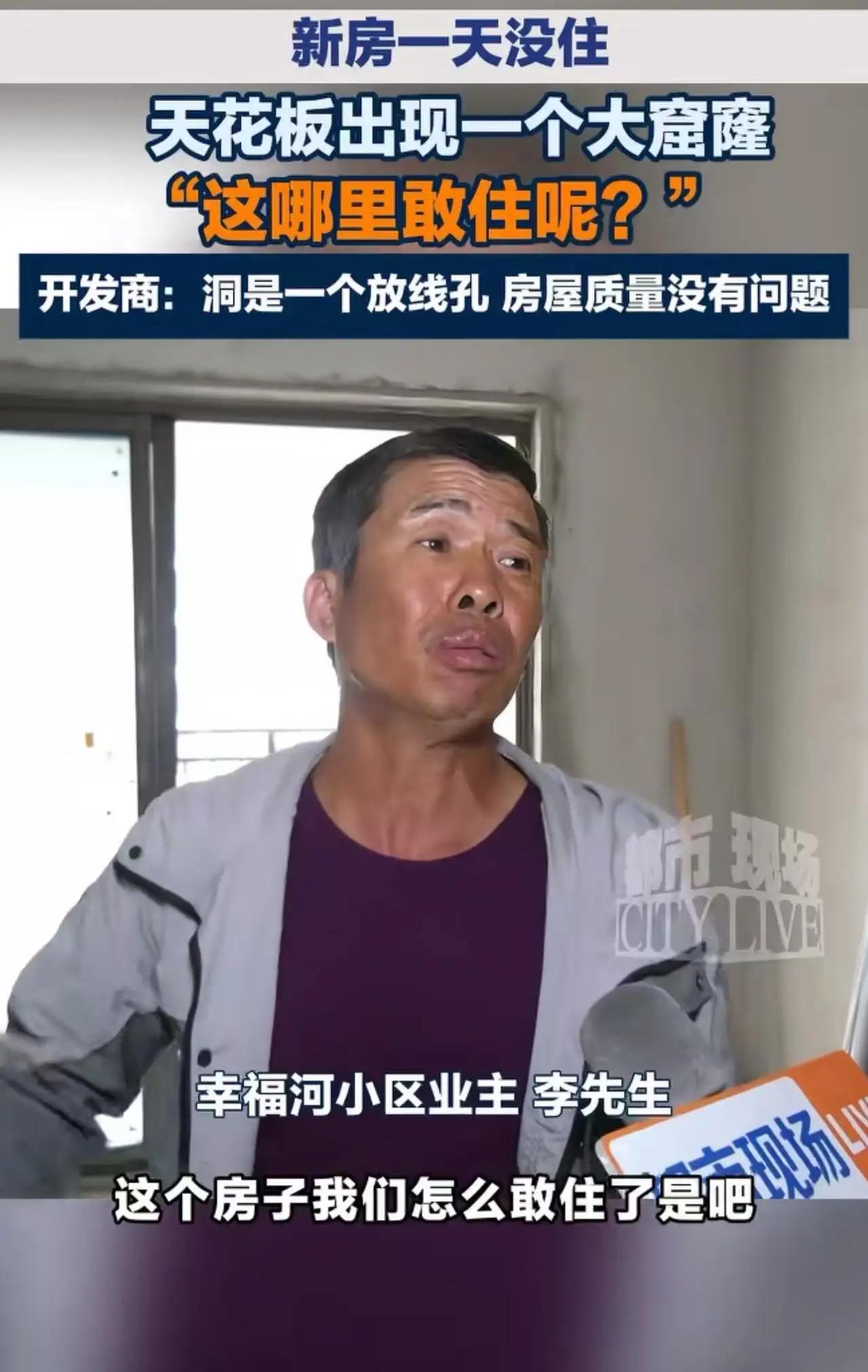 “拿生命安全当儿戏!”江西南昌,新房一天没住,天花板突然塌出大窟窿,男子崩溃哭诉:“这我哪里敢住?完全没有水泥!”开发商神回复:“洞是一个放线孔,房屋质量没有问题!”网友:事实摆在面前,还敢这样说话,了不起!