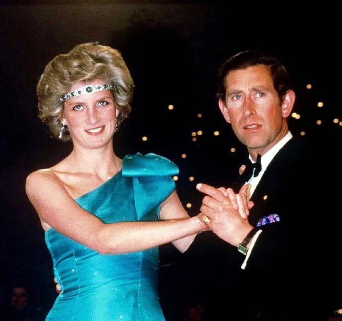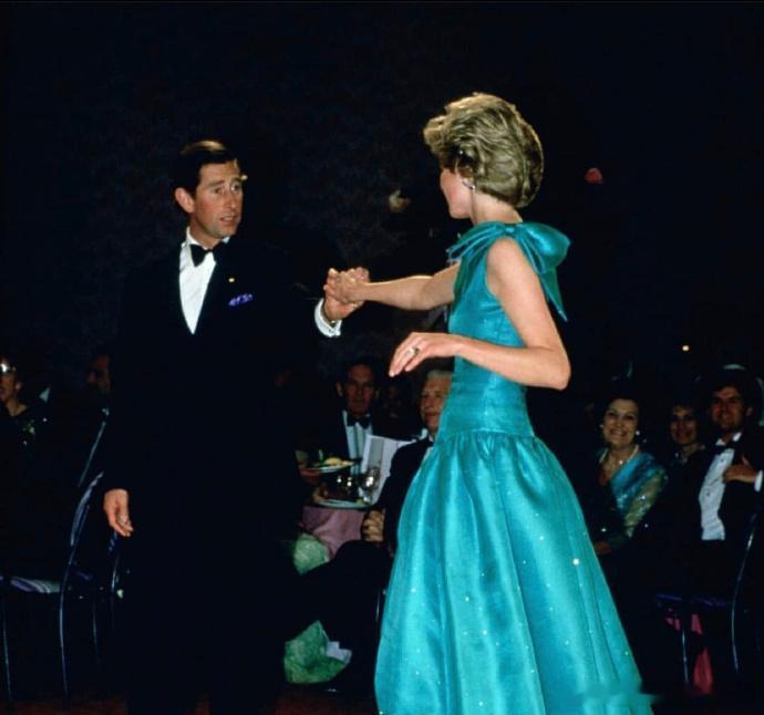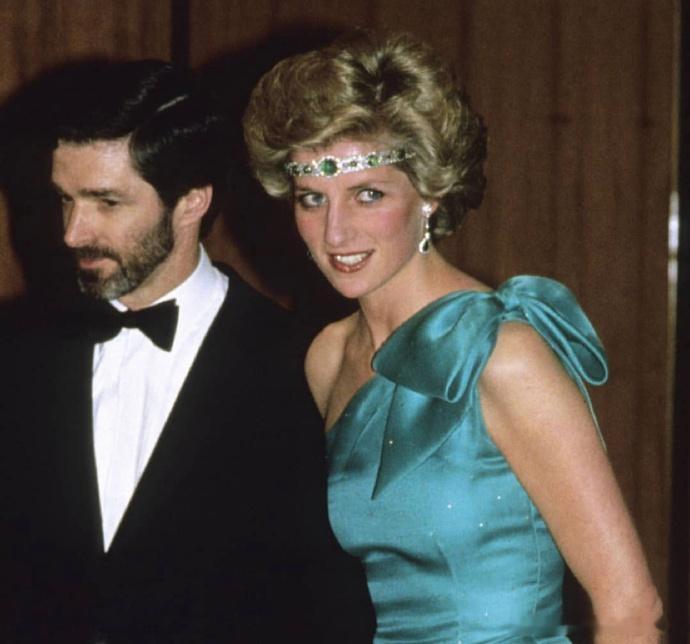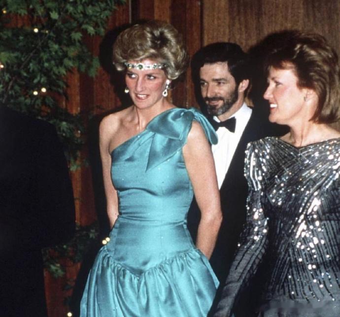 1985年10月,戴安娜第二次访问澳大利亚,她的tiara被留在英国,所以她临时戴上了祖母绿钻石项圈作为头饰(这个项圈原属于英国的玛丽女王,后来传给了伊丽莎白二世),并且搭配一条单肩的翡翠绿长裙。