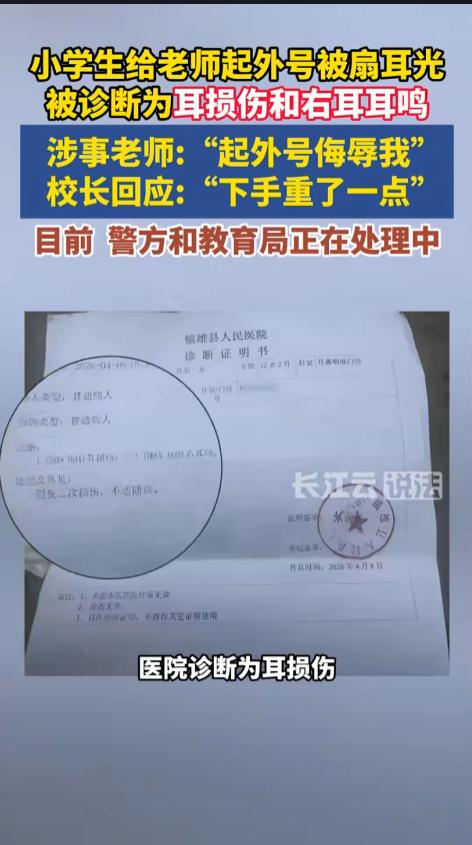 信息来源:《12岁小学生给老师起外号,被扇四耳光致耳损伤。》长江云说法