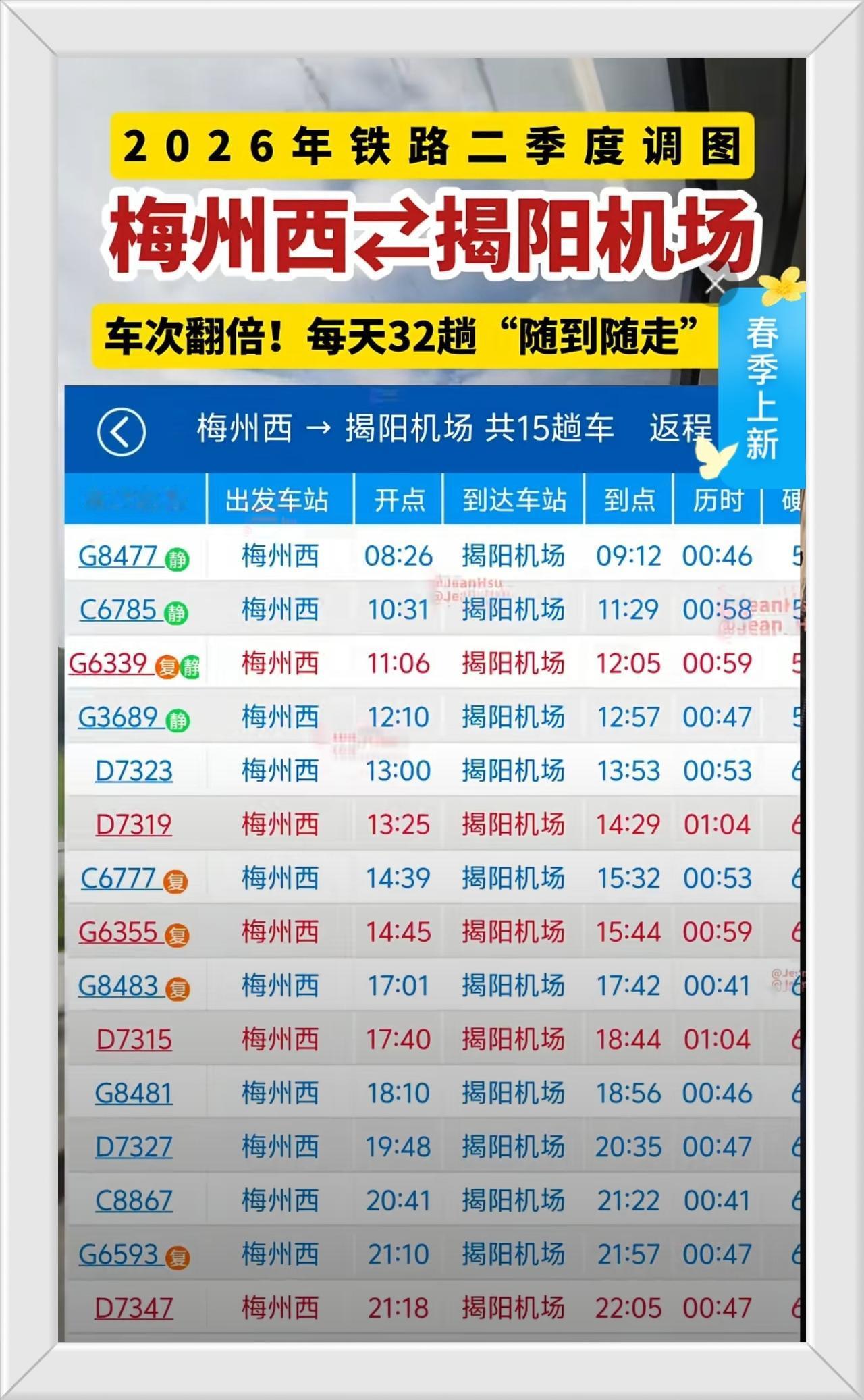 广东省粤东地区“揭梅”高铁大飞跃,每天对开车次翻倍! 2026年铁路二季度调图