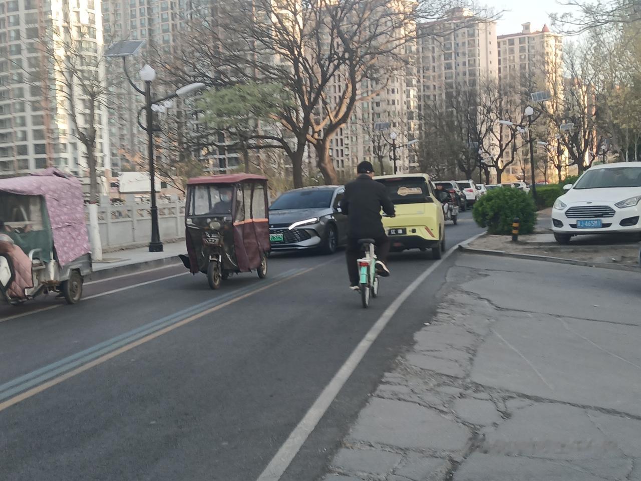 可是,你看:堤顶路只有两个车道,顶多四米宽,西侧却停满车辆;小区门前的路也是一样,两侧都是车辆,如果遇到上下班高峰,堵的水泄不通!