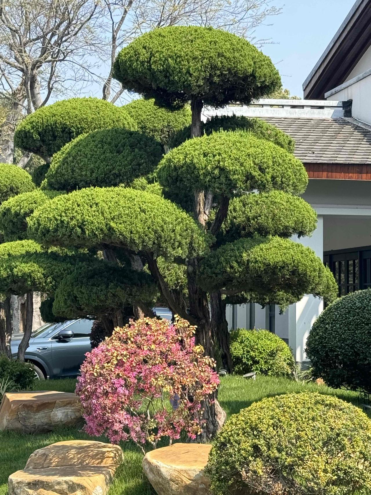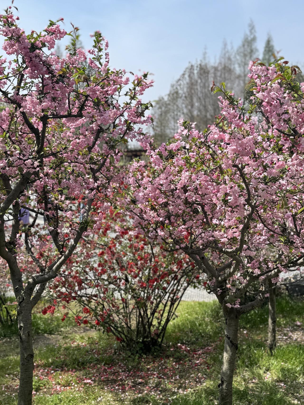 春水绕庭,花燃枝桠,粉蕊轻摇,绿松层叠。春光漫染园间,花影与树姿相融,风过处携花香,满院皆是温柔与生机。