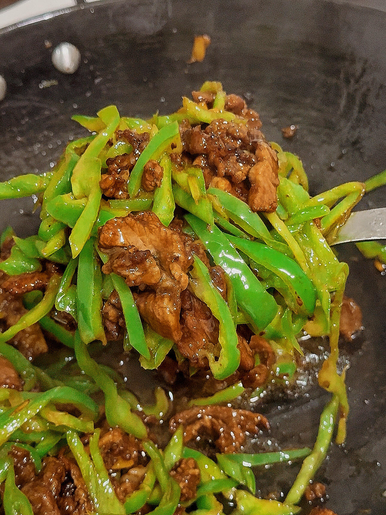 3. 把之前炒好的肉片倒回锅中,开大火快速翻炒均匀,让青椒的鲜辣和猪肉的香味充分融合,翻炒1-2分钟。