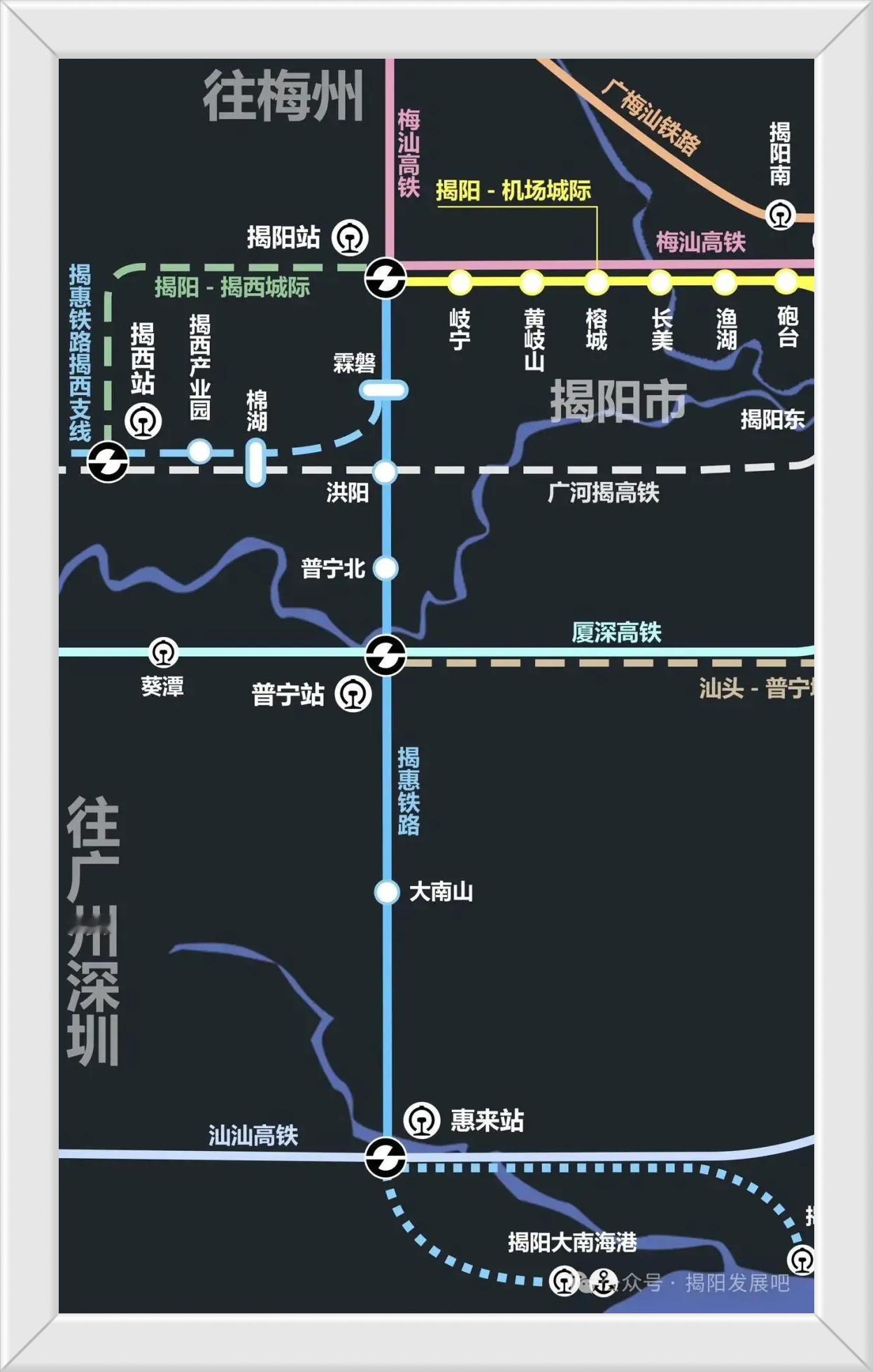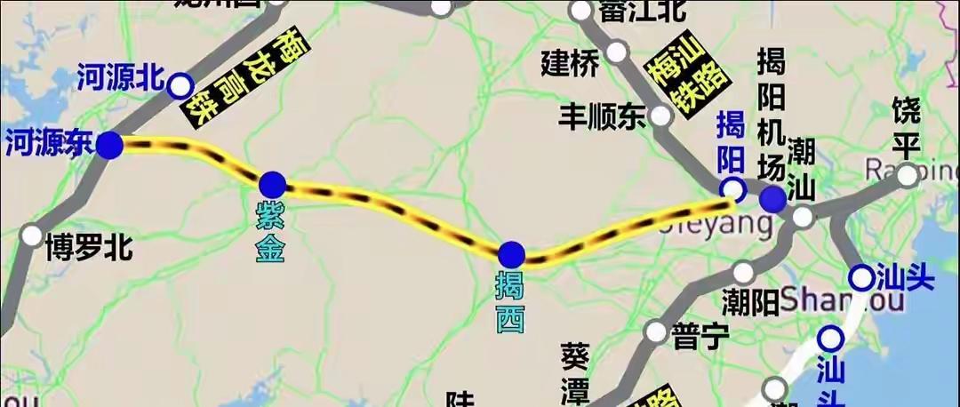 揭阳市境内这条高铁线路将把汕汕高铁“惠来站”和厦深高铁“普宁站”及梅汕高铁“揭阳站”串联并站。同时也是350“河揭”高铁的起点。
