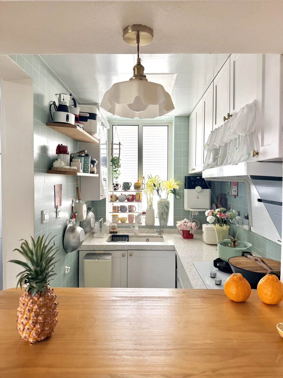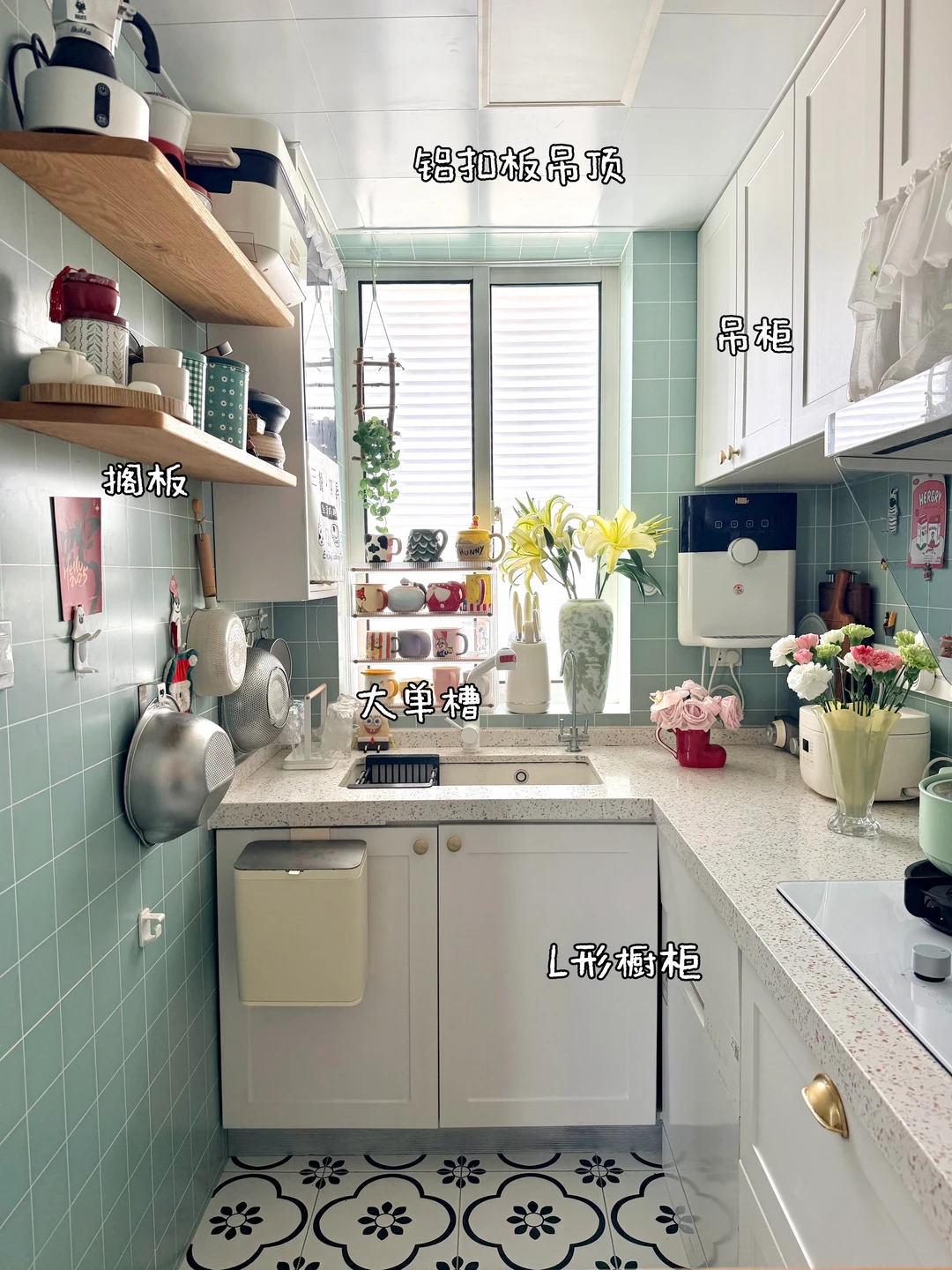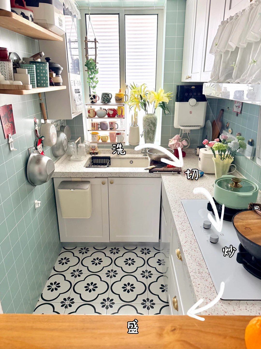 ◾️薄荷绿墙砖搭配白色柜子,清新又显大