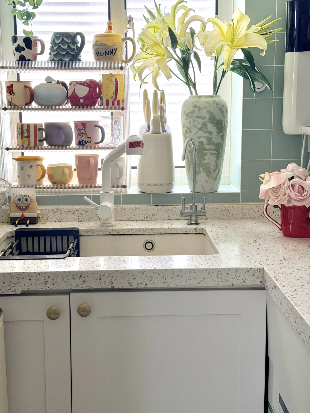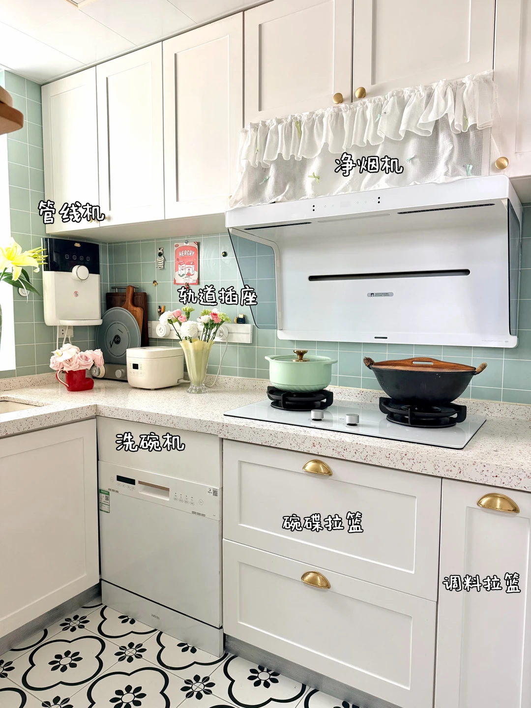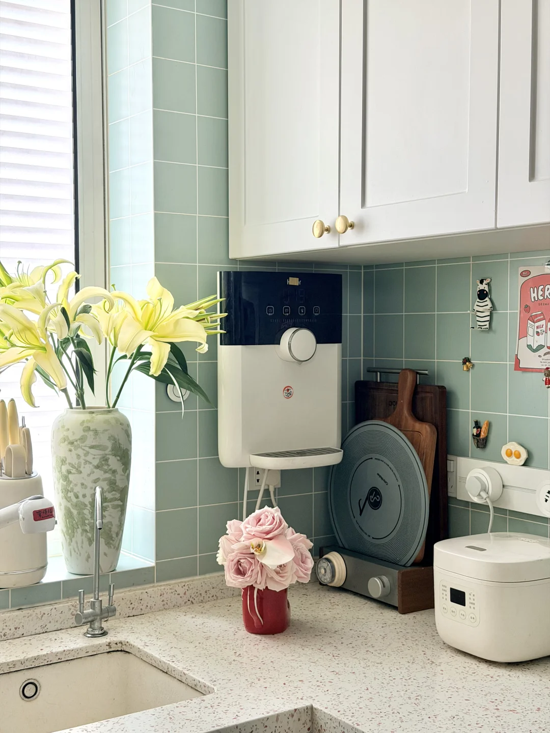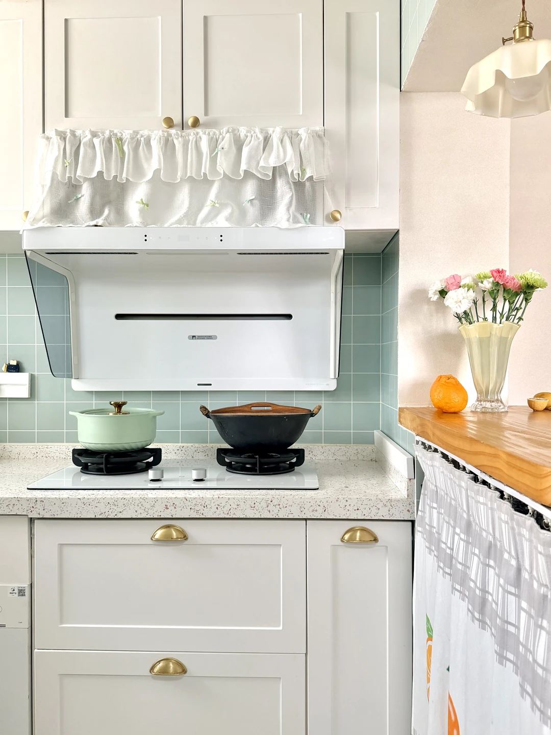 ◾️薄荷绿墙砖搭配白色柜子,清新又显大