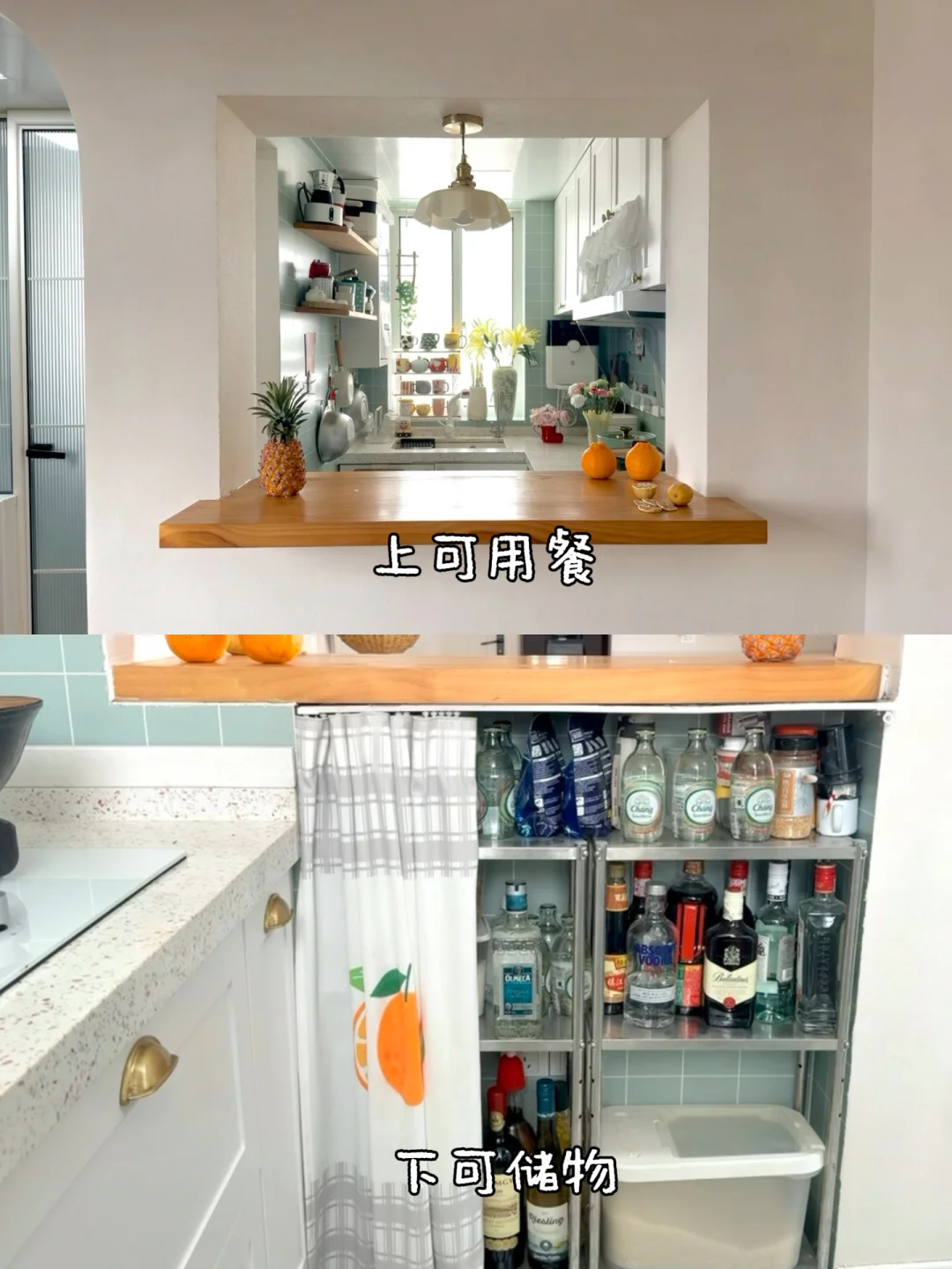 弄了个室内窗,把厨房变成半开放式厨房,让空间感更加丰富。可以一边做饭一边跟客厅的人聊天,增强了互动性~它不仅是一个小窗口,还是个传菜小吧台,下方还可以储物,实用一百分💯。