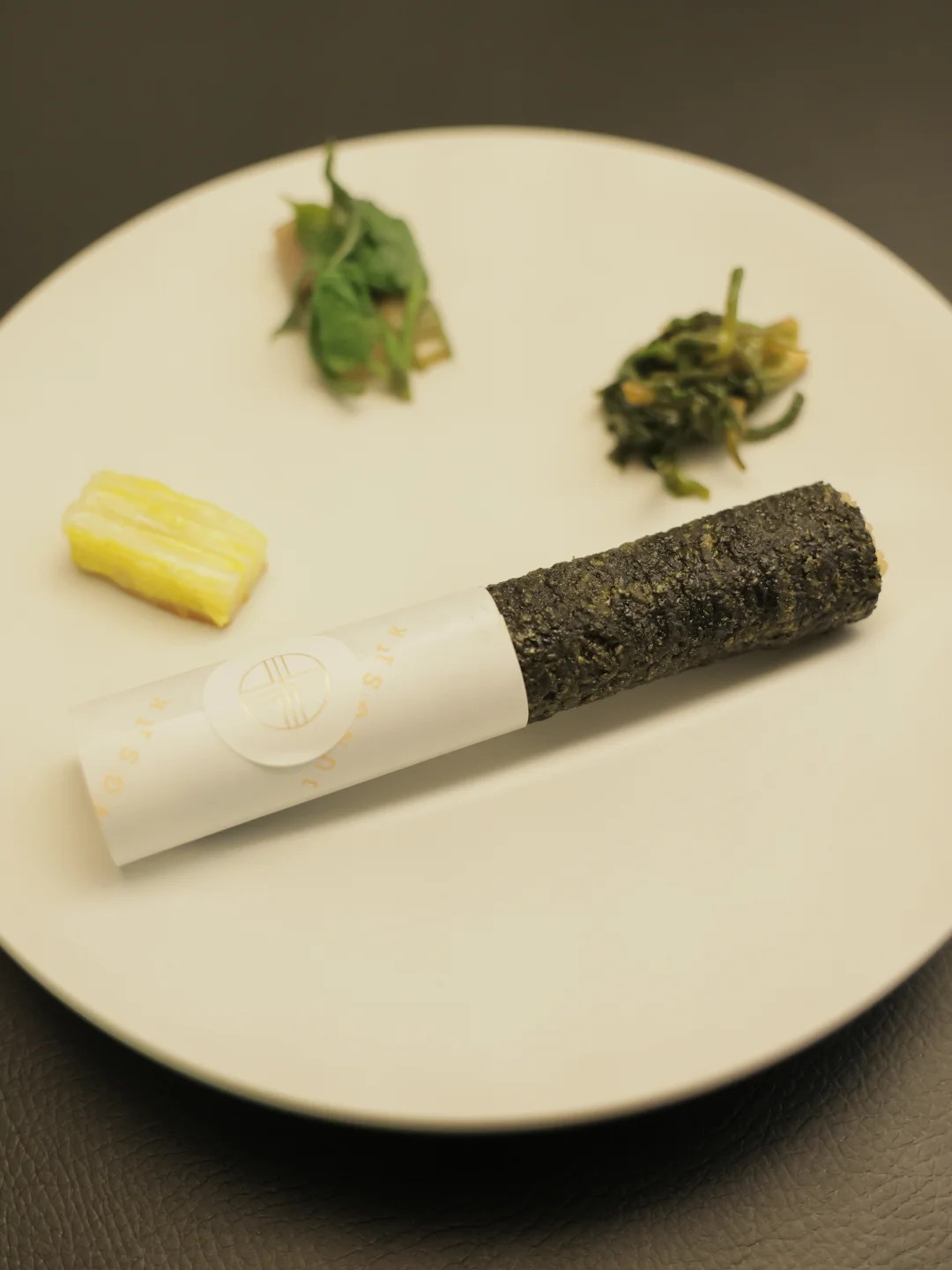 紫菜中间包着米饭,餐盘上搭配了三款不同的野菜。海苔在包着这么长的米饭,竟然能保持利落的酥脆感。