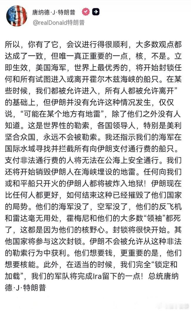 对,你没看错。美伊谈崩了,川皇很生气,于是他一气之下宣布,将派出美国海军封锁霍尔木兹海峡。从他的措辞来看,他这个封锁应该不是只针对伊朗,真的是全面封锁,因为他后面还补充说将会派美军寻找并拦截所有向伊朗支付过路费的船只,向伊朗付钱过海峡的其他国家船只将“无法在公海上安全航行”。