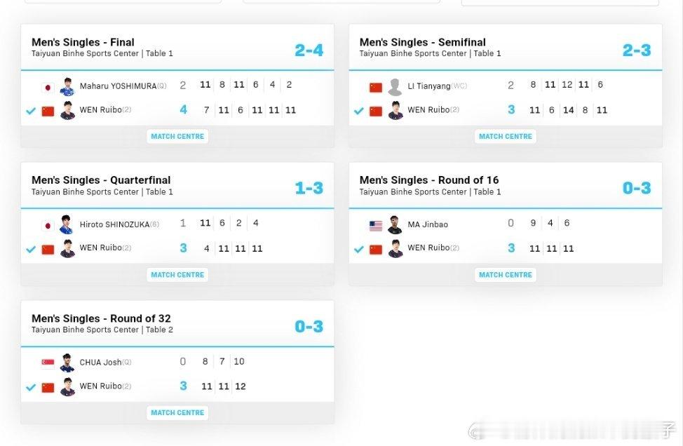 温瑞博太原站双冠 温瑞博获得2026WTT太原常规挑战赛男单冠军的夺冠之路🏆🔥决赛:4比2吉村真晴🇯🇵(-7,8,-6,6,4,2)半决赛:3比2李天阳🇨🇳(8,-6,12,-8,6)¼决赛:3比1筱塚大登🇯🇵(-4,6,2,4)1/8决赛:3比0马金宝🇺🇸(9,4,3)1/16决赛:3比0蔡劭恒🇸🇬(8,7,10)